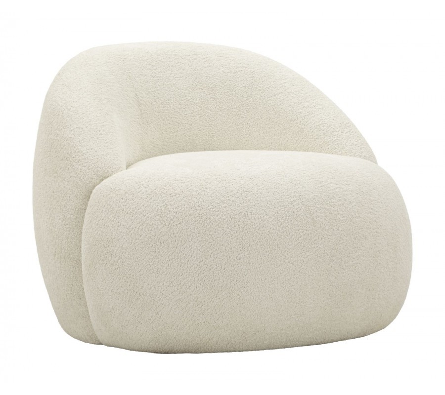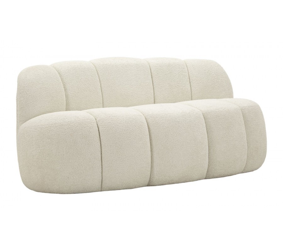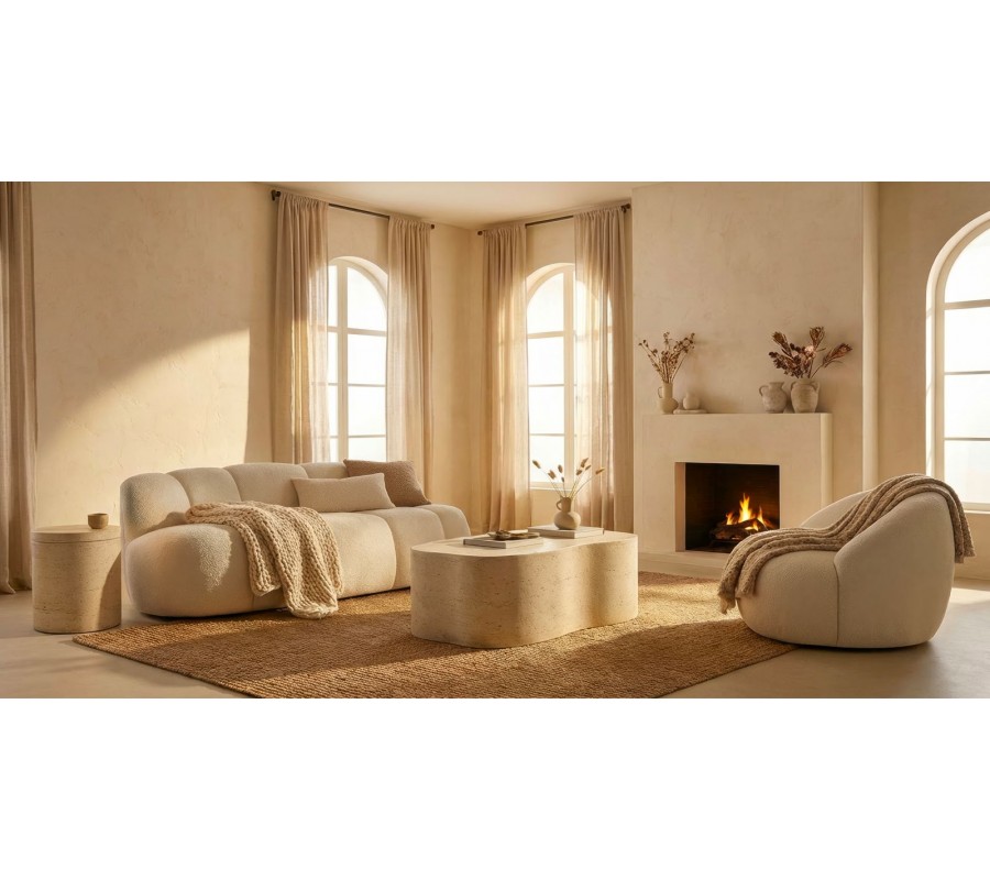 Základem sestavy je dvousedačka s ikonickou siluetou ve stylu cloud sofa. Výborně se s ní propojuje křeslo se zaoblenými liniemi. Potahové provedení z bílé plyšové textilie oba kusy nábytku sjednocuje. Zároveň je příjemné na dotek a působí měkkým teplým dojmem.