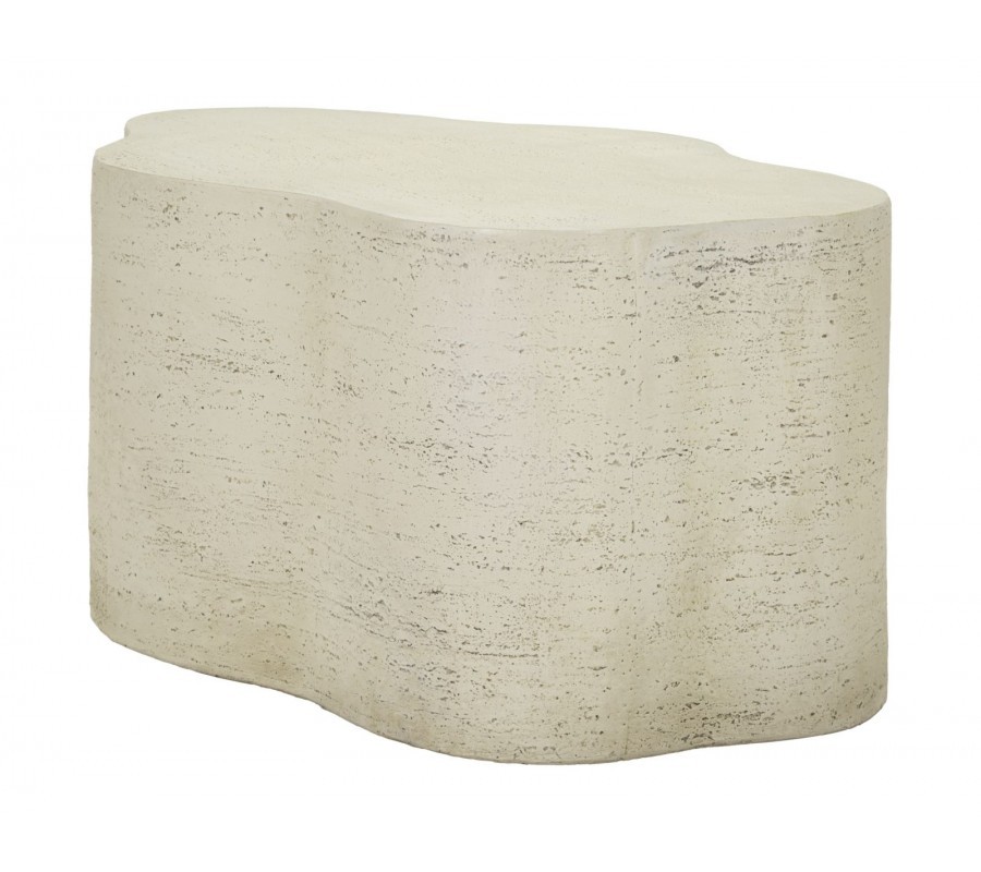Kontrast přinášejí do kompozice kameninové stolky s designem pískovce. Povrch s porézní strukturou a světlá béžová barva působí přírodním, a v kombinaci s výrazným tvarováním až skulpturálním dojmem. Konferenční stolek má asymetrickou oválnou siluetu a příruční stolek je kulatý.