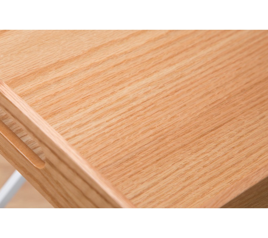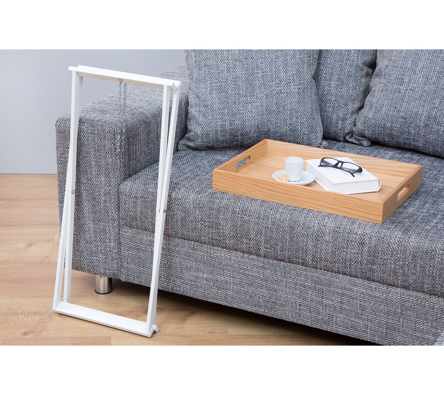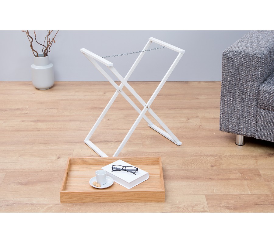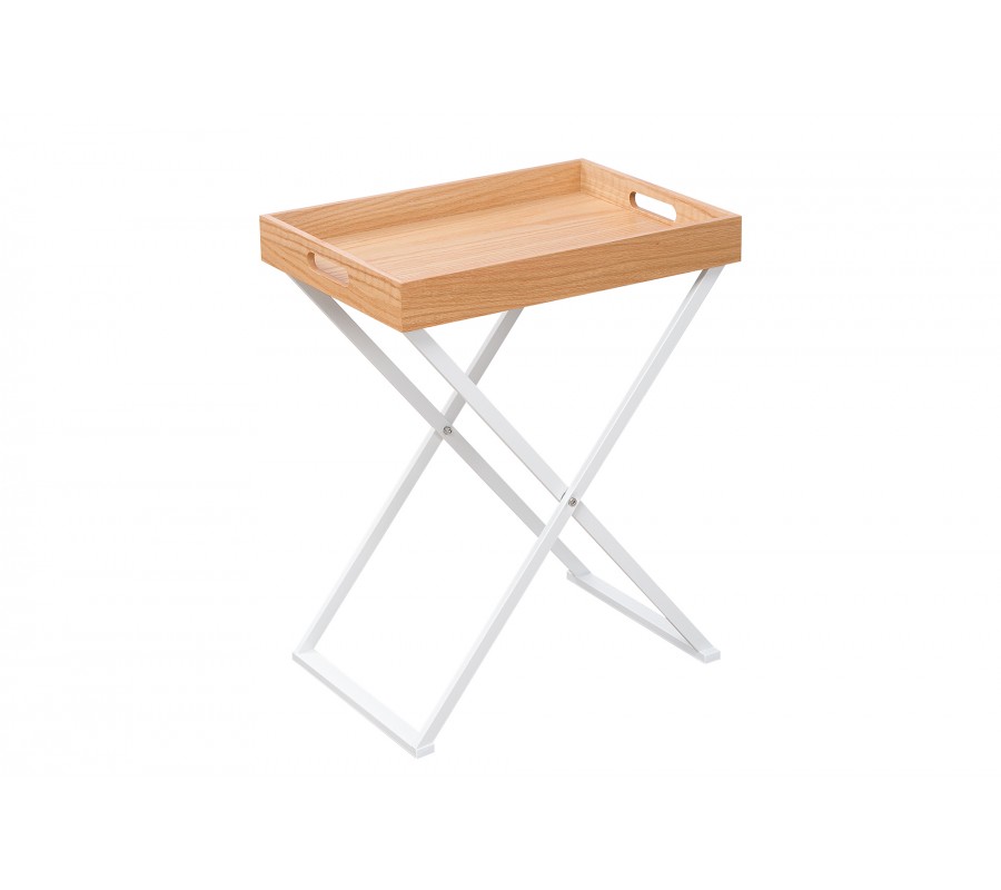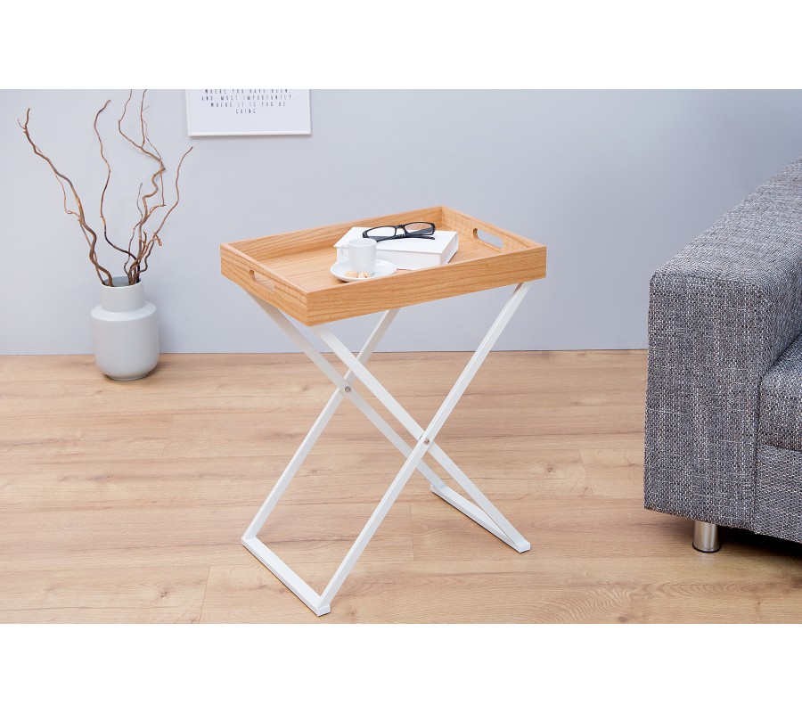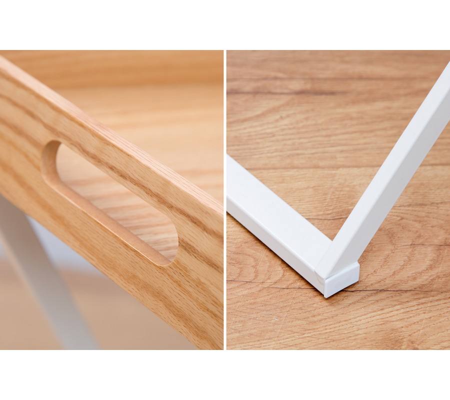 Stylový příruční stolek je velmi praktickým doplňkem do jakéhokoliv interiéru. Díky odnímatelné vrchní desce lze použít mnoho způsoby. Je skládací, proto nezabere mnoho místa a v případě potřeby lze snadno složit. Rám je bílé barvy a vyrobený z kovu. Vrchní deska je z dubového dřeva. Stolek nabízí funkční a stylový design.