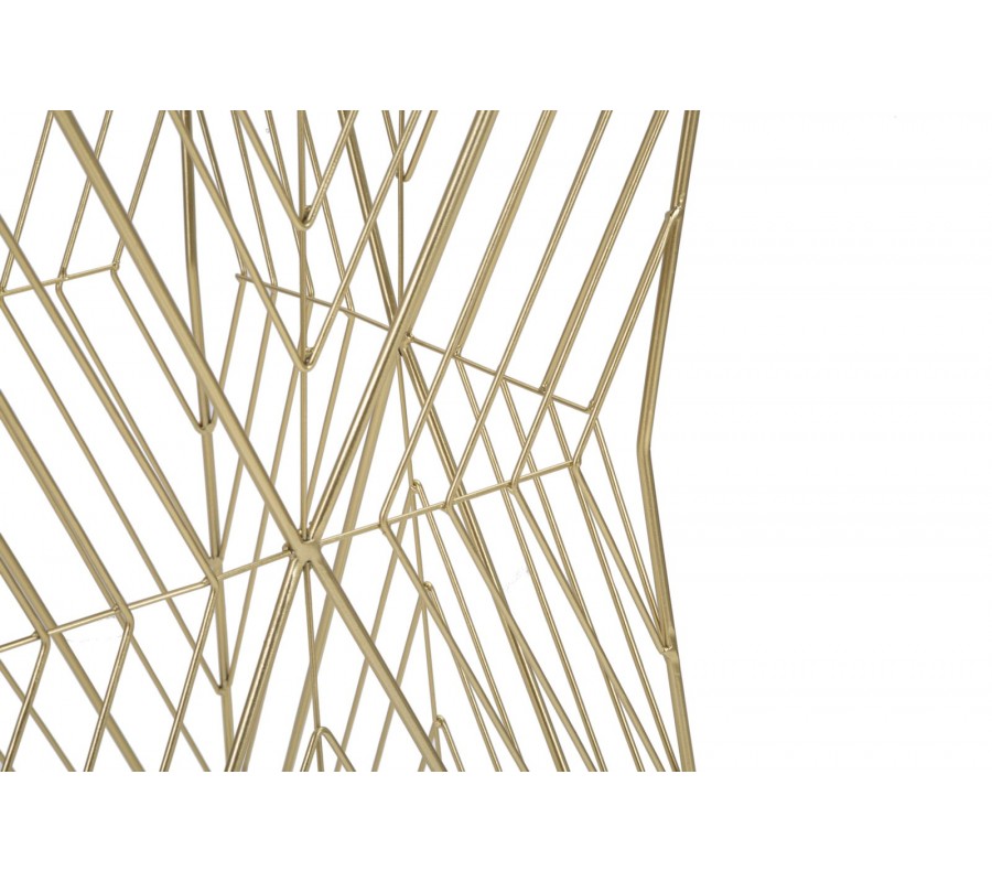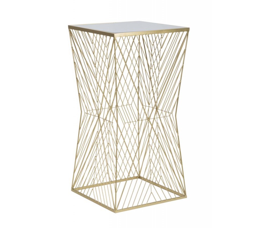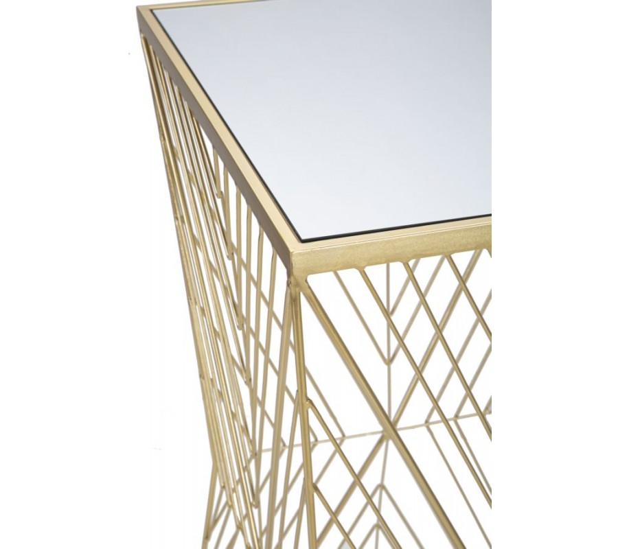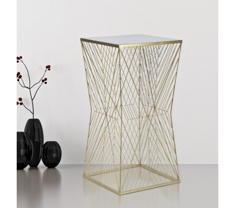Příručný art deco stolek Dimension se vyznačuje elegantní a propracovanou konstrukcí, která spojuje luxusní vzhled s moderní geometrií. Jeho základ i vrchní deska mají čtvercový tvar, což vytváří stabilní a harmonickou strukturu. Rám je kovový s povrchovou úpravou ve zlaté barvě, která dodává stolku sofistikovaný glamour nádech, přičemž jeho propletené linie vytvářejí na stranách vzor ve tvaru X a uprostřed elegantní zúžení. Zlatý kov je zpracován do jemných, zkřížených linií, které se pravidelně opakují a vytvářejí dynamický vizuální efekt. Tento propletený vzor dodává stolku vzdušnost, přičemž jeho konstrukce zůstává pevná a stabilní.