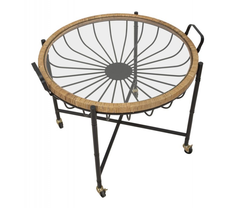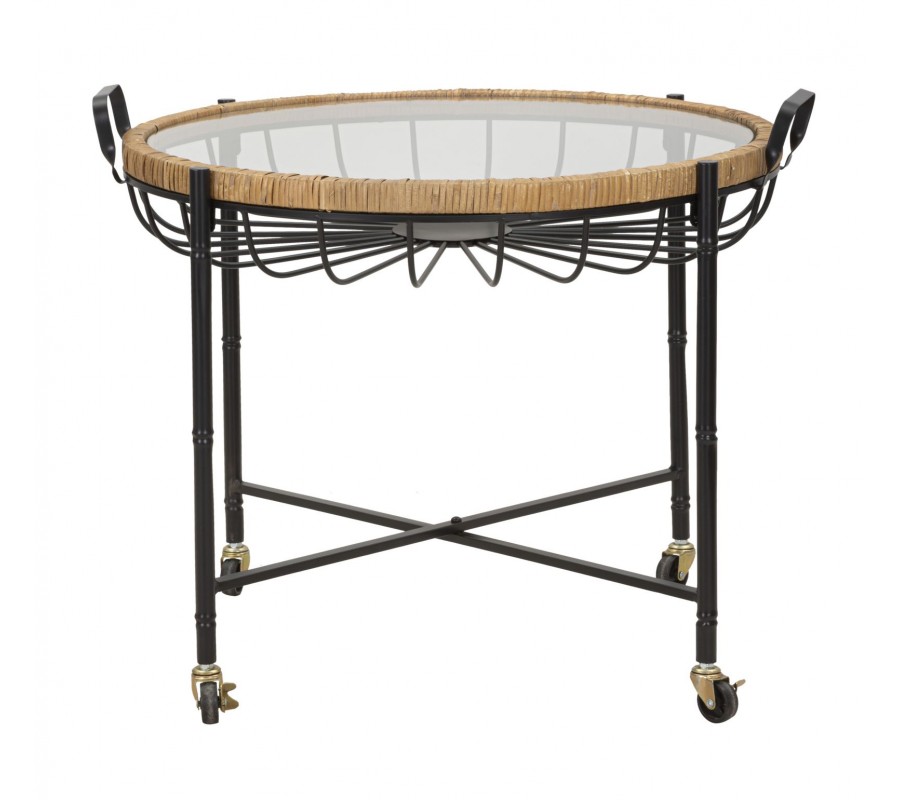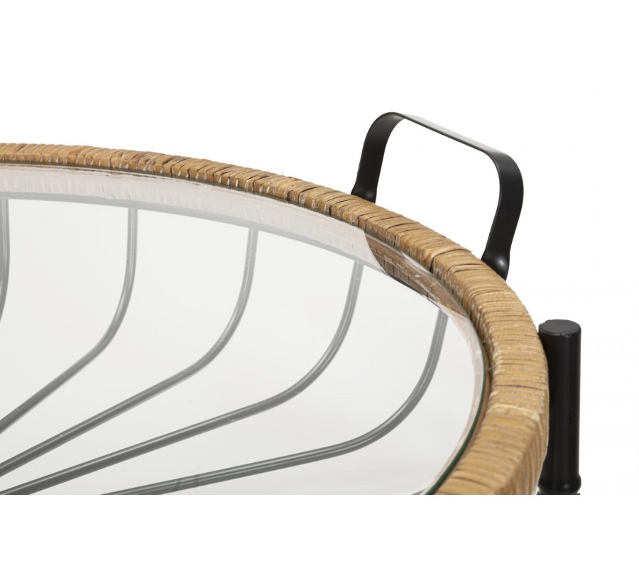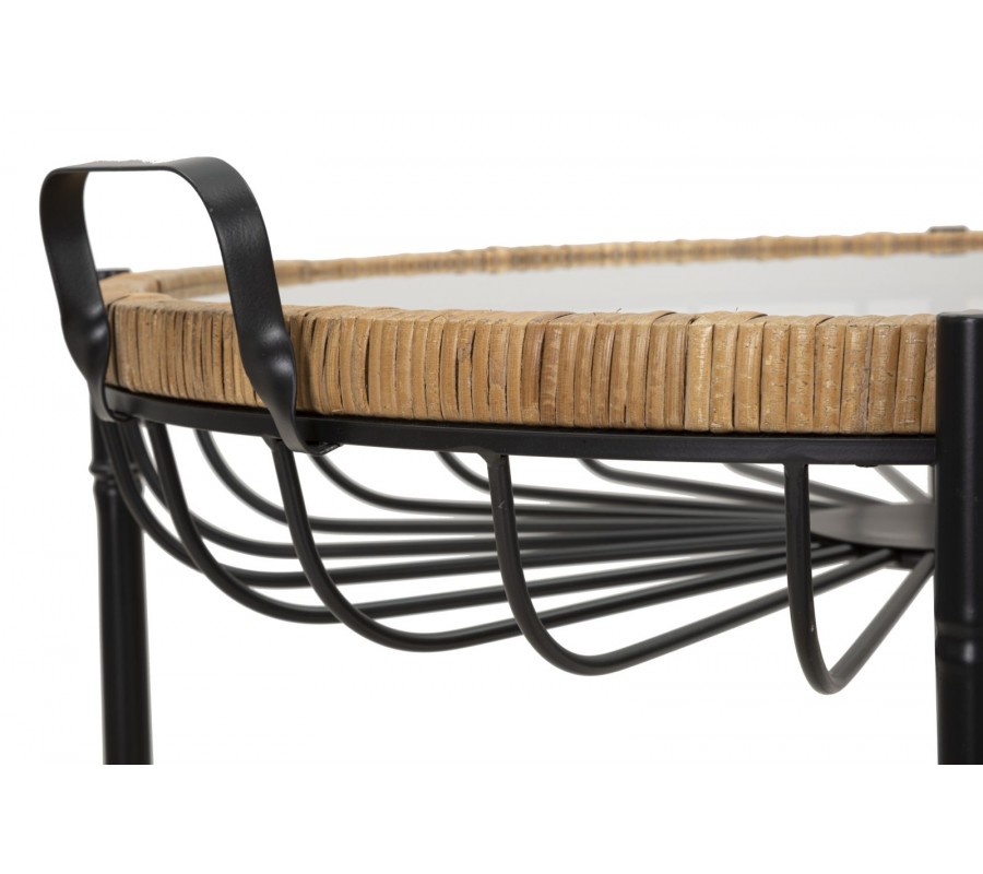 Vrchní deska je ze skla, přičemžokraj je lemován ratanovým rámem, který je dvě praktické kovové rukojeti, které umožňují snadné přenášení. Pod vrchní deskou je dekorativní kovová konstrukce z jemně zaoblených tyčí, které dodávají stolku vzdušnost a jedinečný vzhled.