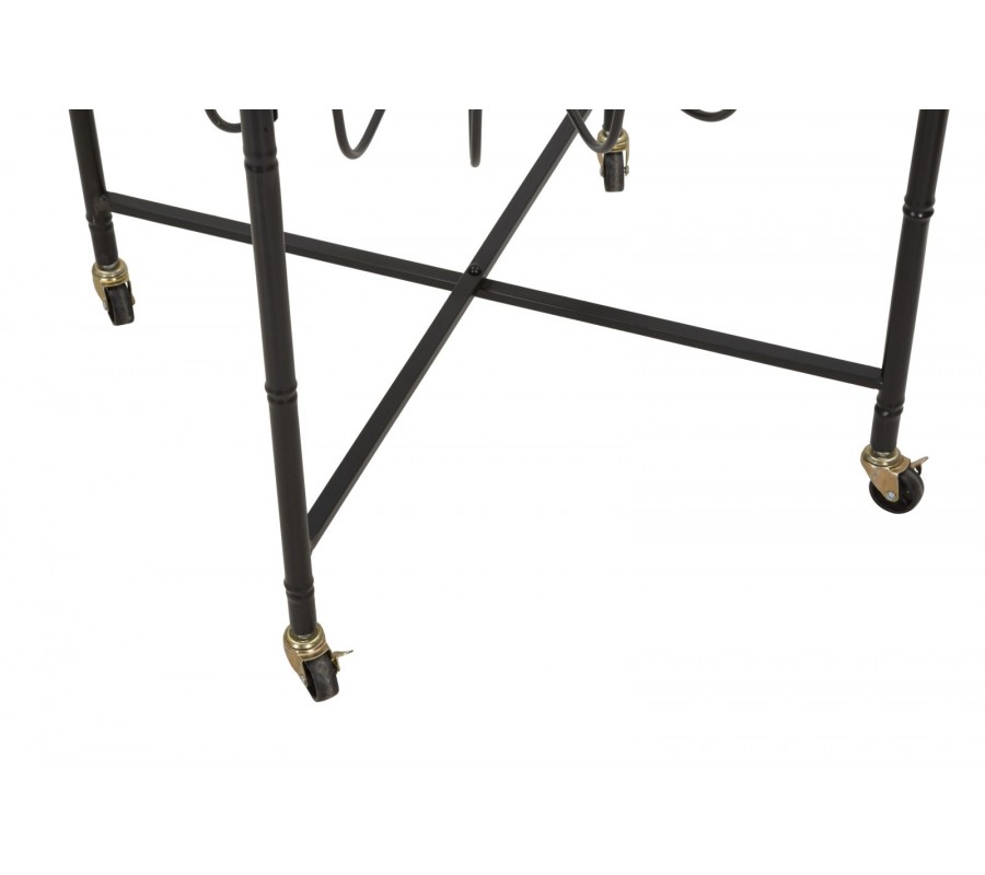 Nohy stolku jsou vybaveny kolečky, díky čemuž se snadno přesouvá . Konstrukce je stabilní, zpevněná příčkami, které jsou ve středu spojeny pro větší pevnost.