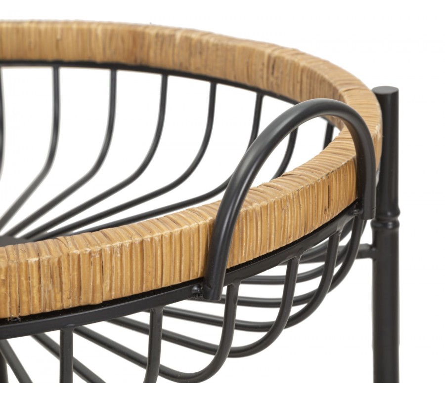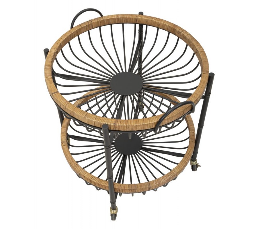 Moderní kulatý kovový dvojitý černý příruční stolek Pavone na kolečkách s ratanovým hnědým rámem 62 cm