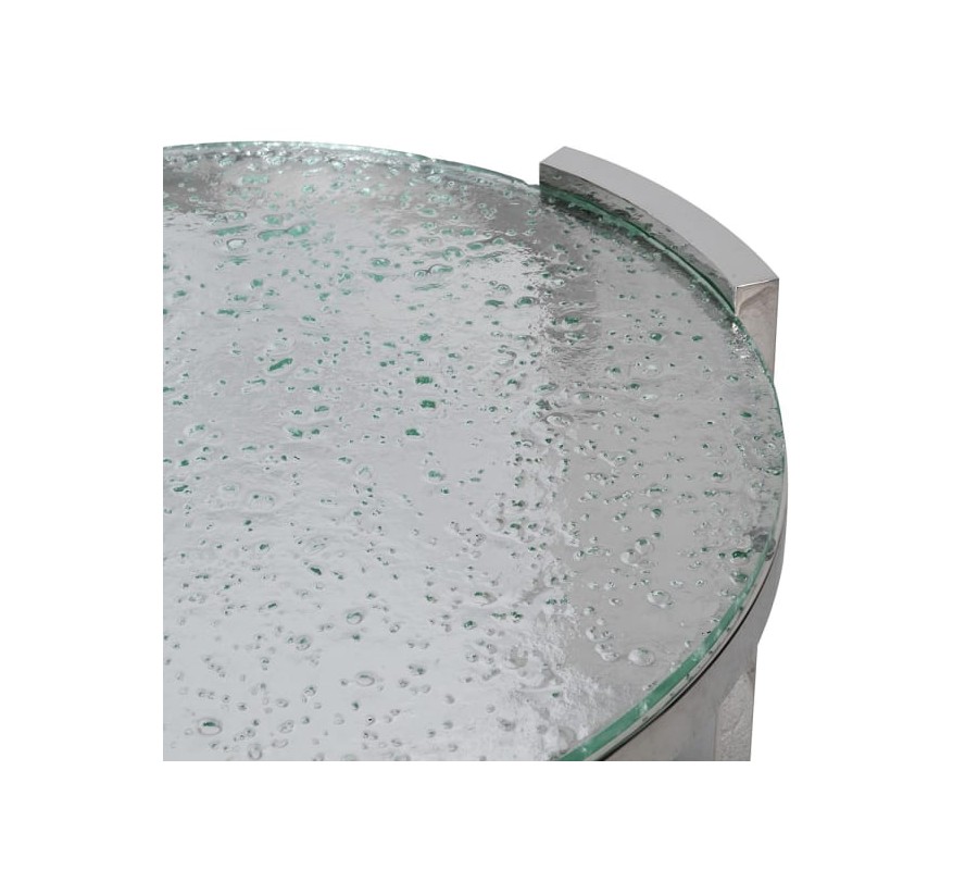Příruční stolek Auron je ukázkou luxusního glamour designu, kde se pojí lesklý kov a originálně zpracované sklo do jednoho harmonického celku. Jeho kulaté deska ztvrzeného skla má výrazný bublinkový efekt, který působí jako umělecký detail a zaručuje, že stolek upoutá na první pohled. Pro vyšší pevnost je pod sklem umístěna dodatečná kovová chromová deska, která zajišťuje stabilitu a odolnost.