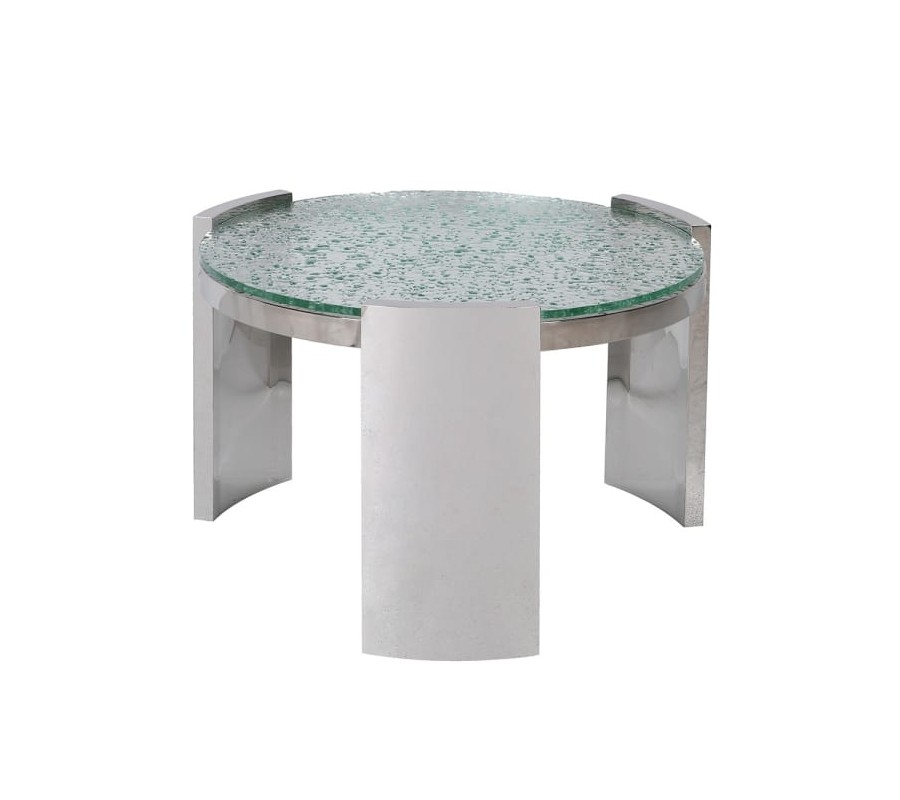 Luxusní glamour chromový kulatý příruční stolek Auron s deskou ze skla s bublinkovým efektem a třemi nožičkami 73 cm