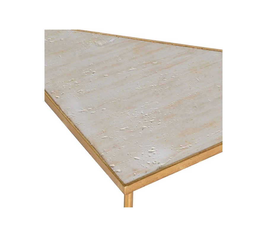 Glamour trojúhelníkový příruční stolek Trinis je originálním designovým kouskem, který vyniká svým netradičním tvarem a sofistikovaným zpracováním. Vrchní deska je vyrobena z březového dřeva s bílou patinou, která dodává povrchu jemný a elegantní charakter. Boky desky jsou lemovány zlatým kovovým rámem, který ladí s konstrukcí nožiček.