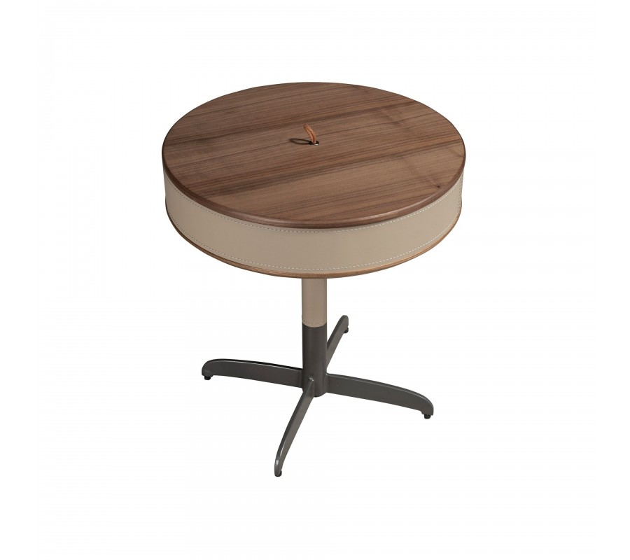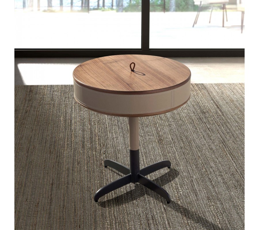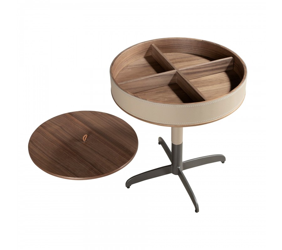 Luxusní moderní kulatý příruční stolek Vita Naturale je jedinečným designovým kouskem, který spojuje přírodní materiály, sofistikované detaily a praktickou funkčnost. Jeho vrchní část je vvyrobena z přírodní ořechové dýhy, která dodává interiéru teplý a útulný nádech. Dřevěný poklop je vybaven malou úchytkou z pletené hovězí kůže v hnědé barvě, která působí originálně a stylově. Pod vrchní deskou se ukrývá praktický úložný prostor se čtyři samostatnými odnímatelnými přihrádkami, které se po nadzvednutí poklopu snadno otevírají a poskytují místo na drobnosti. Tím spojuje estetiku s funkčností. Stolek je ukázkovým příkladem moderního italského designu, který spojuje krásu s praktičností.