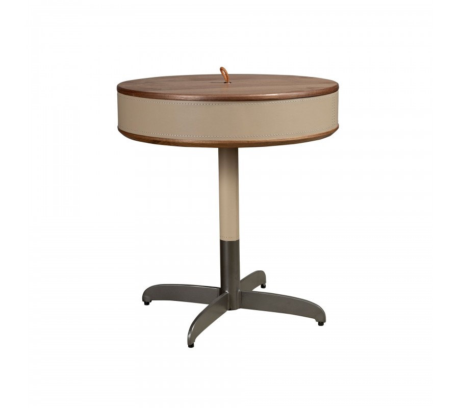 Luxusní moderní hnědý kulatý příruční stolek Vita Naturale s koženým béžovým potahem a úložným prostorem 50 cm