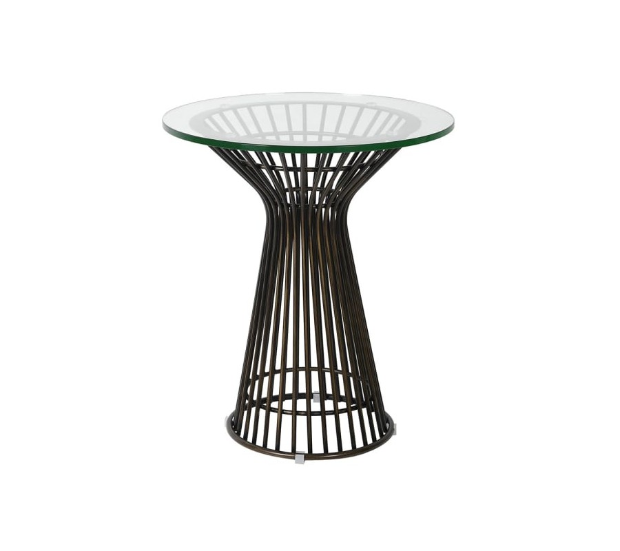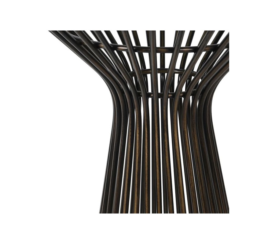 Industriální kulatý příruční stolek Hour zaujme svou originální konstrukcí ve tvaru přesýpacích hodin. Kovová základna z vertikálních tyčí připomínajících pruty je zesílena pěti spojovacími kružnicemi – jednou u spodní části, jednou nad základnou, třetí v nejužším bodě, čtvrtou těsně pod deskou a poslední v místě jejího ukotvení. Tento design vytváří dynamický a zároveň stabilní vizuální efekt.