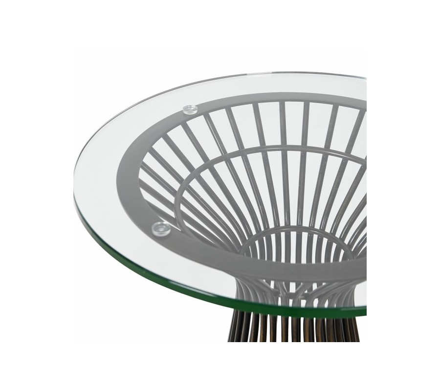 Horní část stolku je doplněna o průhlednou tvrzenou skleněnou desku, která působí snadno a vzdušně, ale zároveň je pevná a praktická pro každodenní používání. Kontrast mezi robustním kovem a elegantním sklem podtrhuje luxusní industriální charakter tohoto kusu.