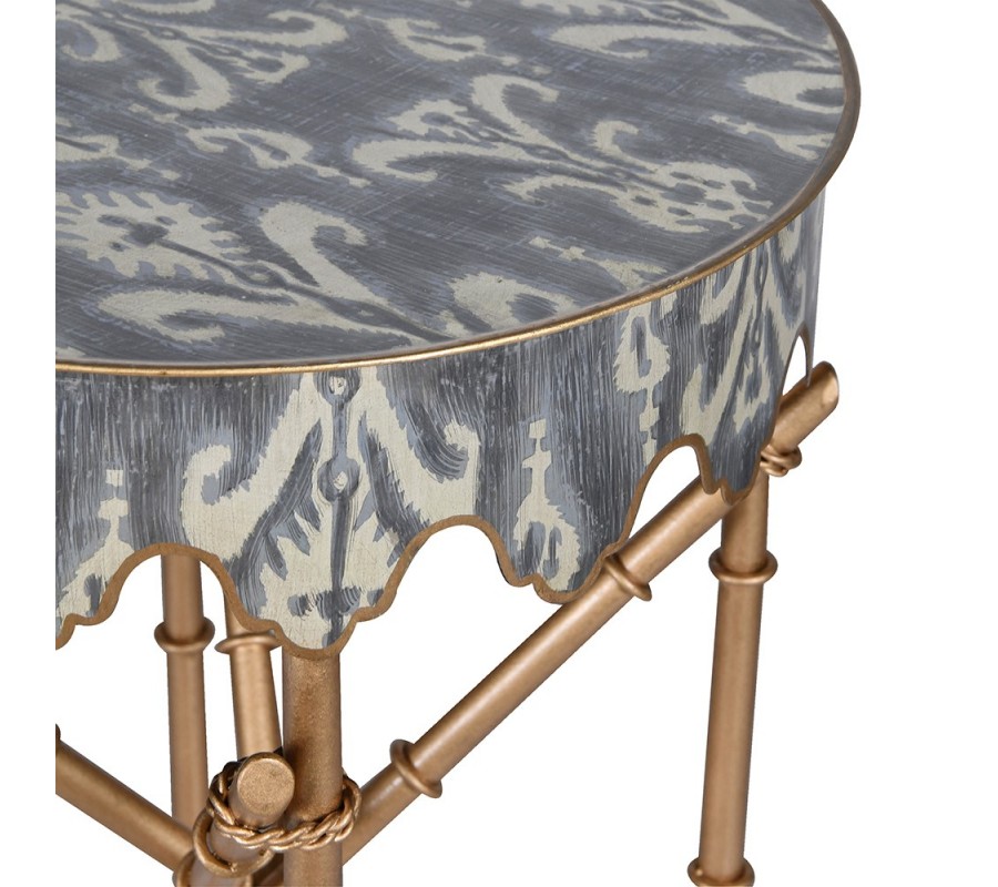 Etno modrý kulatý příruční stolek Mirano s dekorativní kresbou ze železa ve zlaté barvě s překříženými nožičkami 51 cm