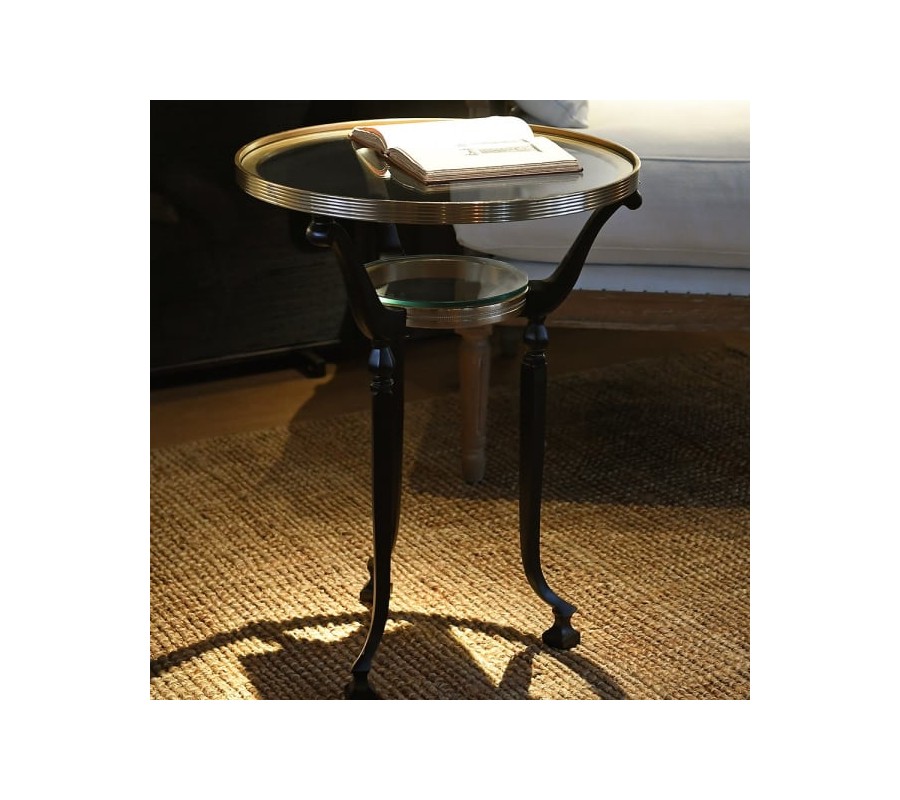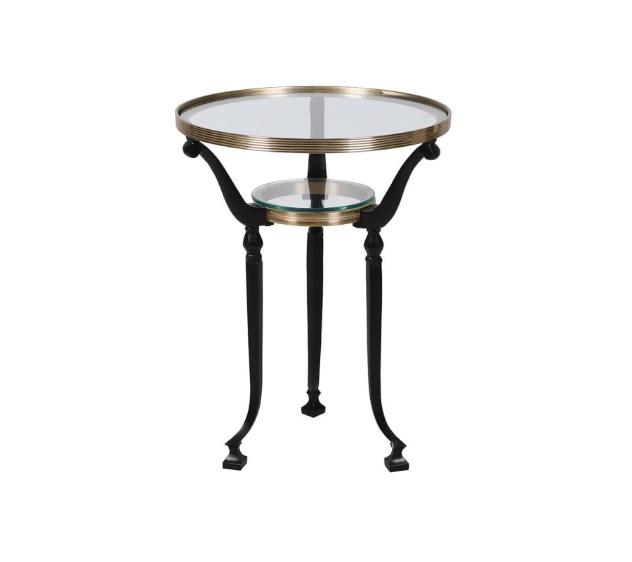 Příruční stolek Dorian přináší do interiéru sofistikovaný dotek vintage elegance. Jeho kulatá konstrukce z černého kovu zaujme jemně zaoblenýma nohama, které působí stabilně a zároveň vzdušně. Vrchní deska i menší odkládací polička jsou vyrobeny zčirého skla a po obvodu je lemuje zlatý kovový rám s jemným profilováním, který dodává stolku luxusní a starožitný vzhled.