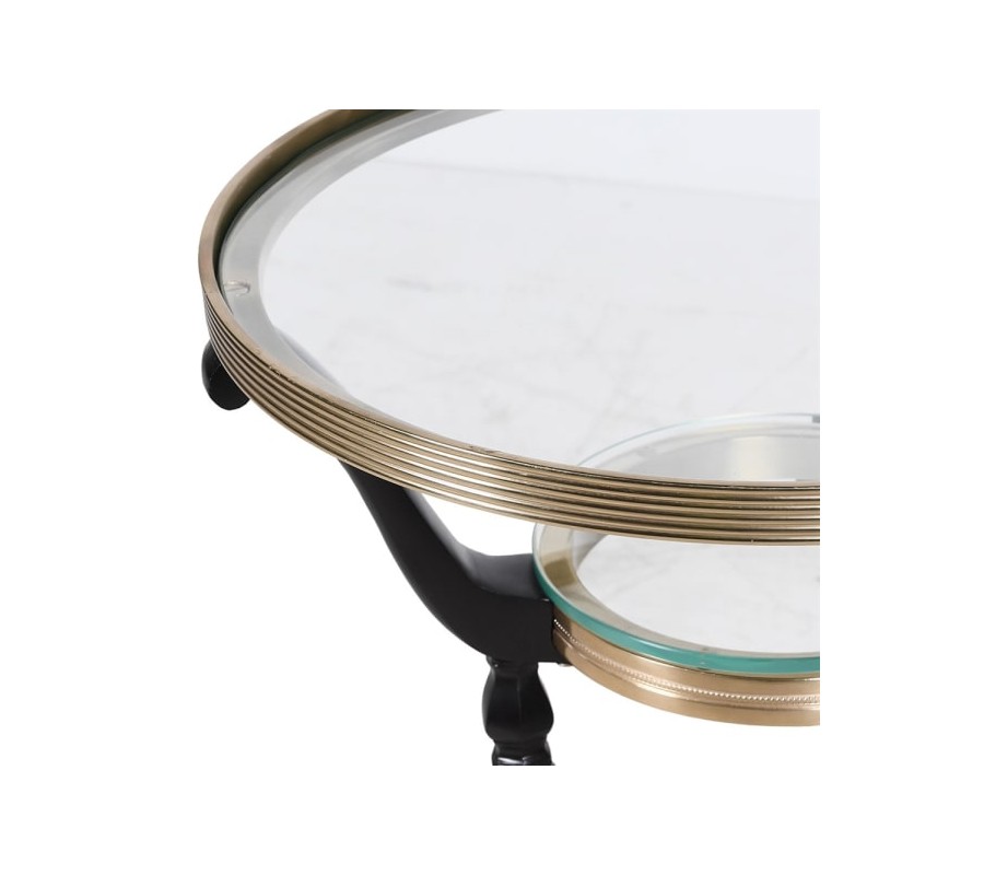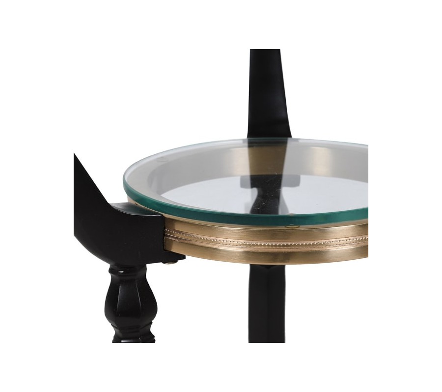 Vintage kulatý příruční stolek Dorian s černou kovovou konstrukcí a zlatými detaily s prosklenou poličkou 67 cm