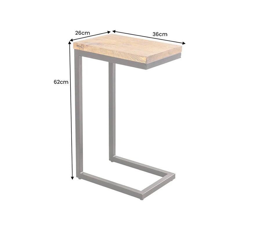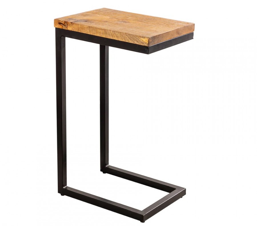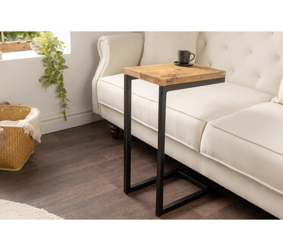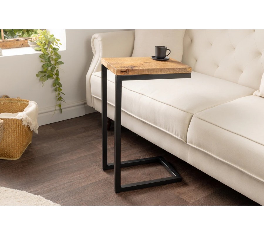 Konstrukce je tvořena hranatými kovovými profily v černém provedení a má praktický tvar písmena „C“, díky kterému lze stolek zasunout k sedačce či křeslu. Umožňuje pohodlné odkládání nápojů, notebooku nebo dekorací, aniž by zabíral spoustu prostoru. Minimalistické linie působí vzdušně a podtrhují industriální moderní styl stolku.