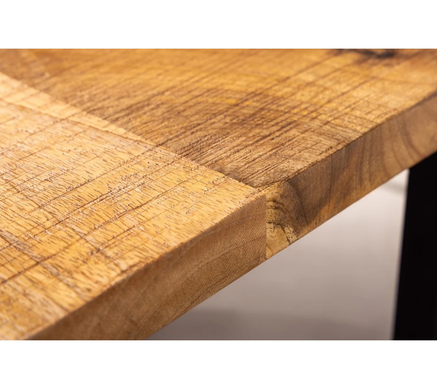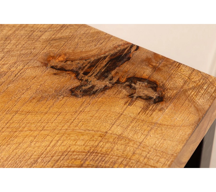 Industriální příruční stolek Mango Natur spojuje masivní přírodní vzhled mangového dřeva s čistými geometrickými liniemi černé kovové konstrukce. Má štíhlou obdélníkovou vrchní desku s výraznou přiznanou strukturou letokruhů, která působí autenticky a dodává nábytku naturální charakter. Povrch dřeva vyniká svými teplými medově hnědými tóny, které vytvářejí příjemný kontrast ktmavé kovové podstavě.