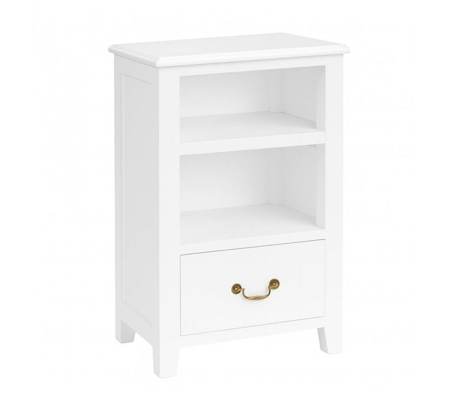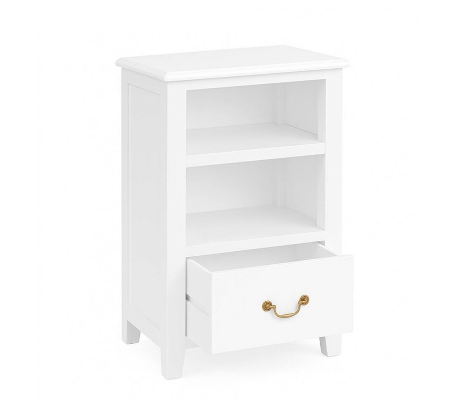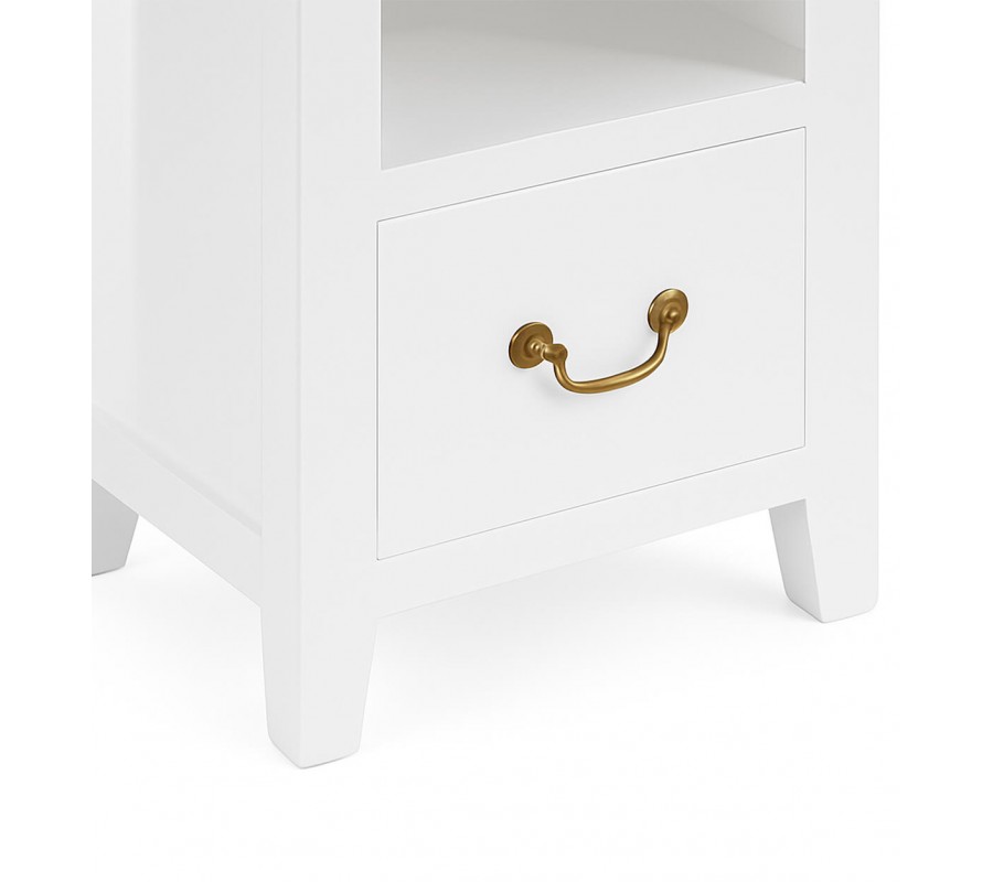 Příruční stolek Donelly vás okouzlí svým designem s nádechem klasického stylu a elegantním provedením v čisté bílé barvě. Oceníte také dodatečný odkládací prostor na dvou policích a v jedné zásuvce, díky kterému jej využijete i jako praktický noční stolek v ložnici.
