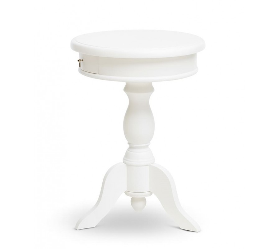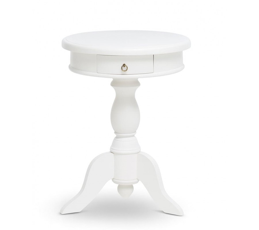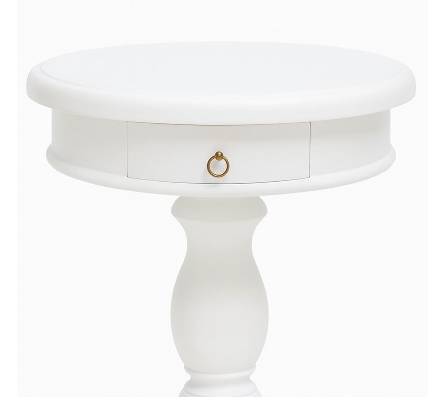 Luxusní provensálský kulatý příruční stolek Mahani se šuplíkem a vyřezávanou nohou z mahagonového dřeva v bílé barvě 65 cm