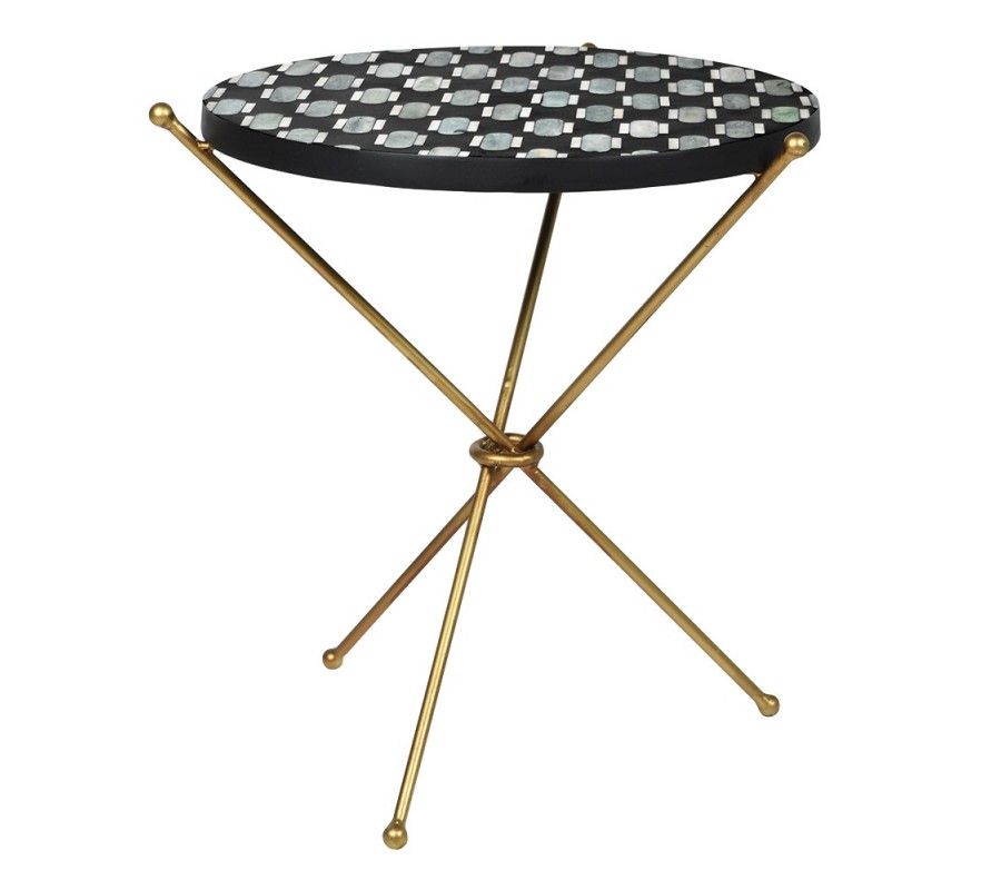 Art deco kulatý černo modrý příruční stolek Jahim s intarzií z kosti a mosaznými kovovými překříženými nožičkami 45 cm
