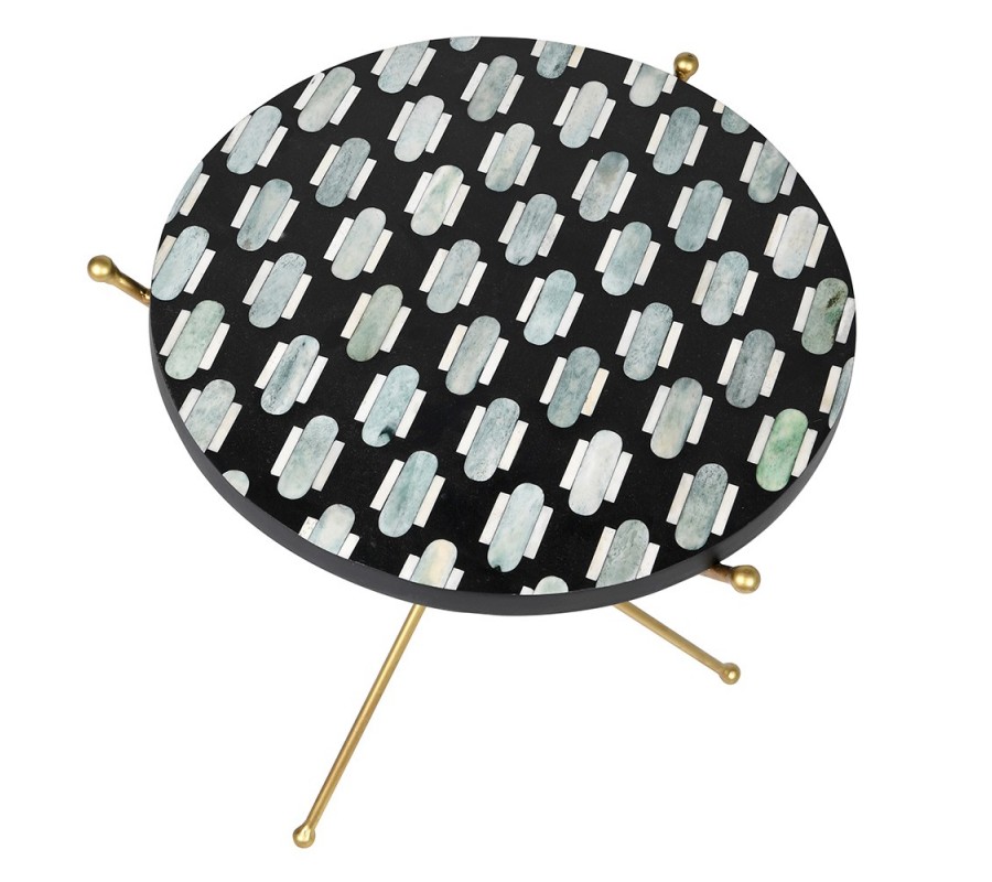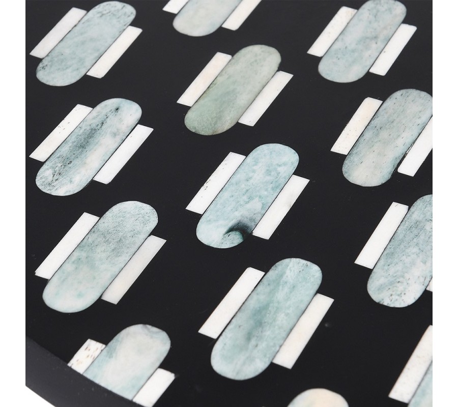 Dizajnový příruční stolek Jahim představuje sofistikované spojení art deco estetiky, glamour stylu a precizního řemeslného zpracování. Je navržen jako výrazný akcentový kus, který okamžitě upoutá pozornost a dodá interiéru luxusní charakter. inlay. Tyrkysově modré a bílé geometrické vzory v podobě obdélníků a oválných tvarů vytvářejí rytmickou kompozici s jemným nádechem exotiky a umělecké hravosti.