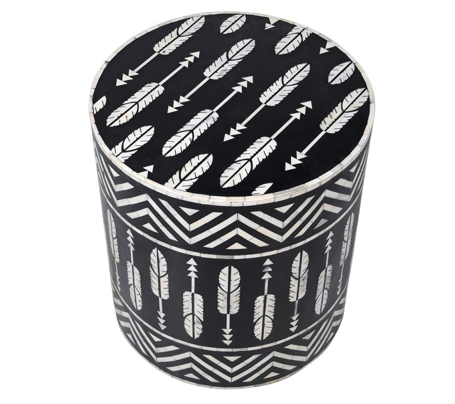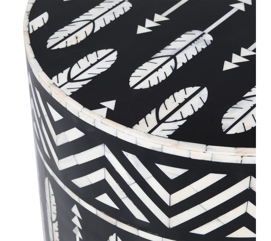 Luxusní etno kulatý černo bílý příruční stolek Daytona s intarzií s trojúhelníkovými a péřovými ornamenty 45 cm