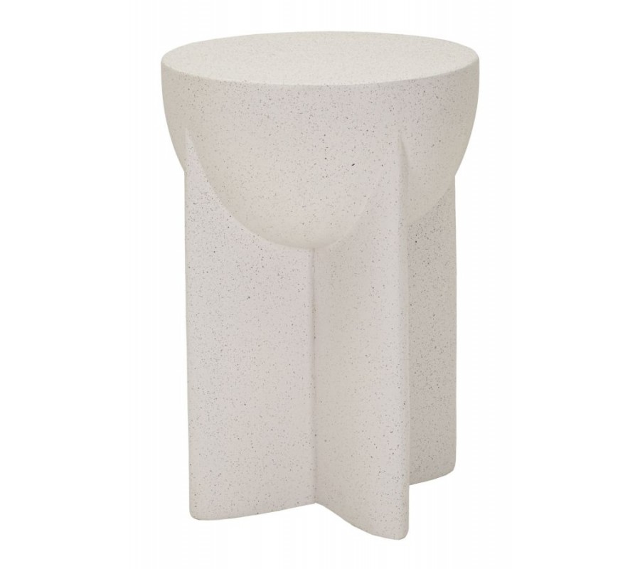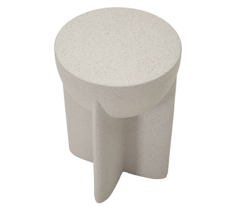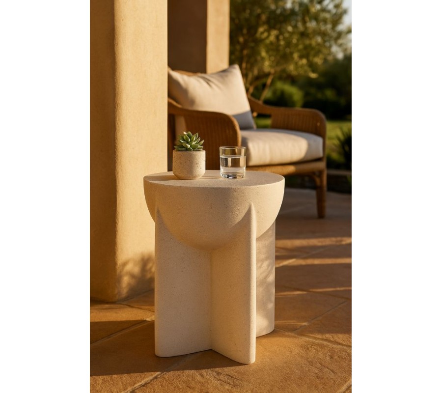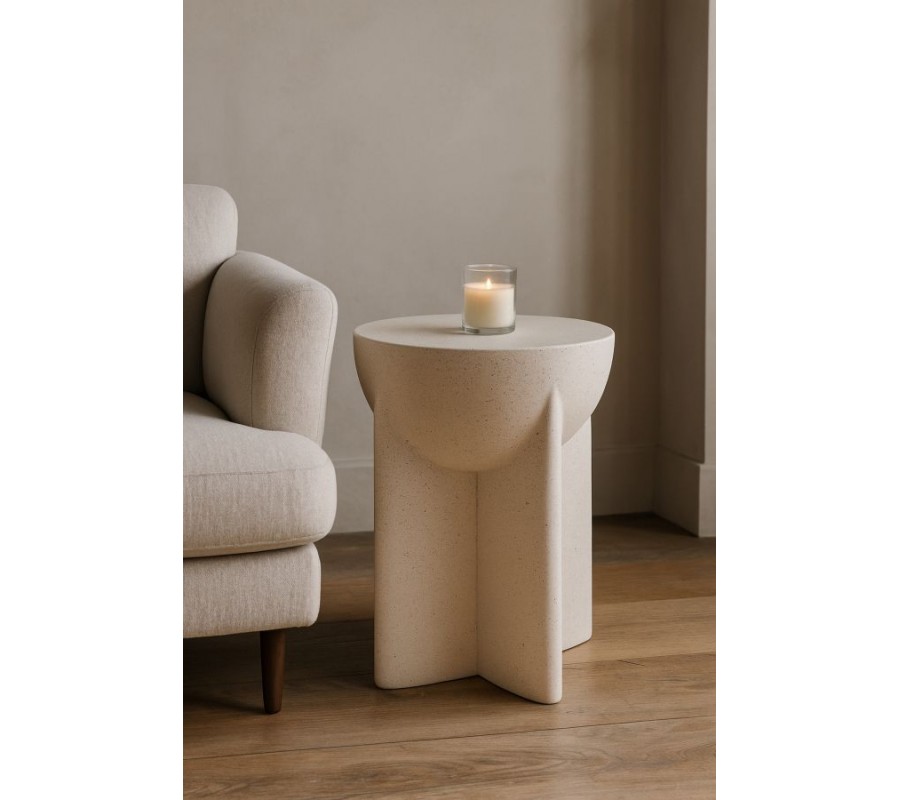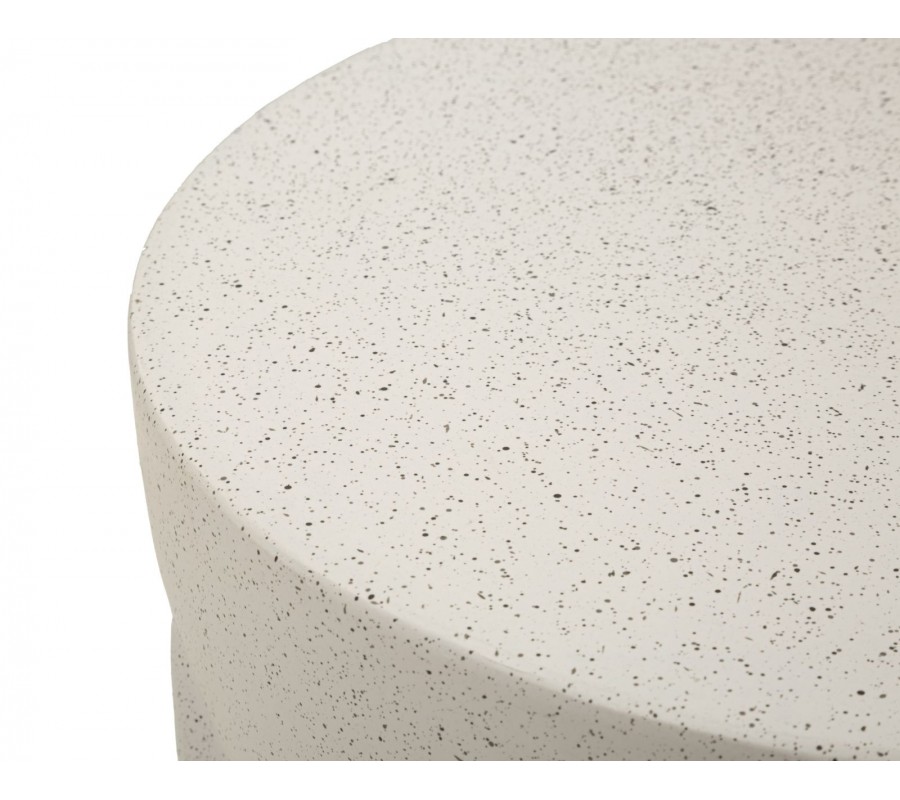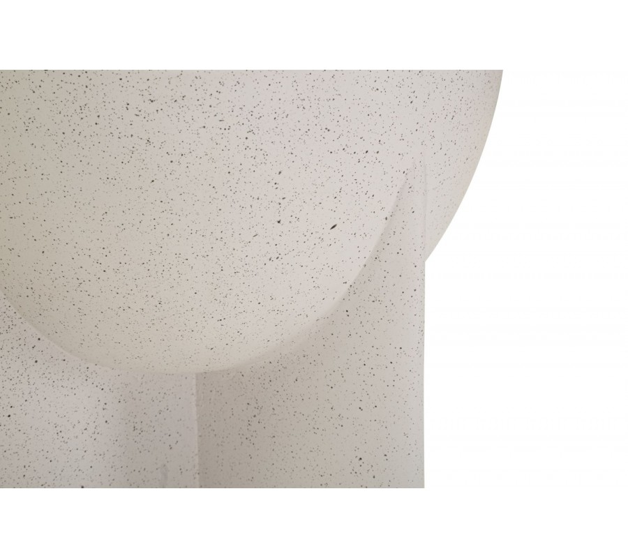 Stolek je vyroben z hořčíkového kompozitu MGO, který se vyznačuje vysokou pevností a odolností. Svým vzhledem a světlým šedým provedením připomíná beton. Drobná tmavší zrna dodávají povrchu jemnou strukturu a vzhled přírodního kamene. Materiál tak působí moderně a zároveň naturálně, s teplým charakterem.