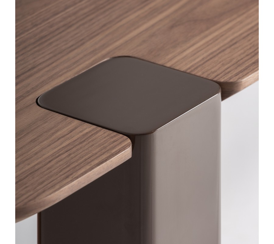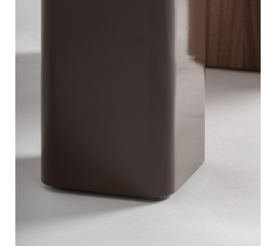 Vrchní deska má jemně zaoblený čtvercový tvar, který působí elegantně a kompaktně. Zajímavým prvkem je konstrukce podnože – stolek stojí na dvou odlišných nohách, které vytvářejí architektonický kontrast. Jedna noha má čtvercový tvar s hladkým lesklým čokoládovým lakem, zatímco druhá je podlouhlá, mírně oválně tvarovaná a obložená dubovou dýhou s výraznou kresbou dřeva. Spoj podnože s deskou je přiznán a viditelný z vrchní strany, což podtrhuje moderní konstrukční detail a dodává stolku charakter designového objektu.