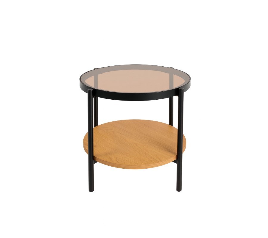 Skleněný retro kulatý příruční stolek Sonny s průhlednou hnědou deskou a dubovou policí s černým rámem 48 cm