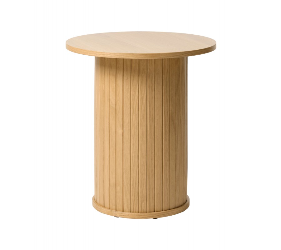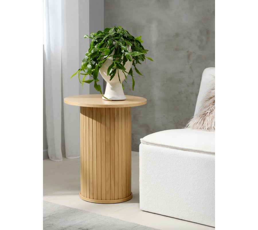 Skandinávský kulatý příruční stolek Bornholm s lamelovým dekorem v přírodním světlém hnědém dubovém provedení 55 cm