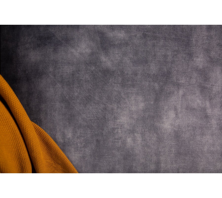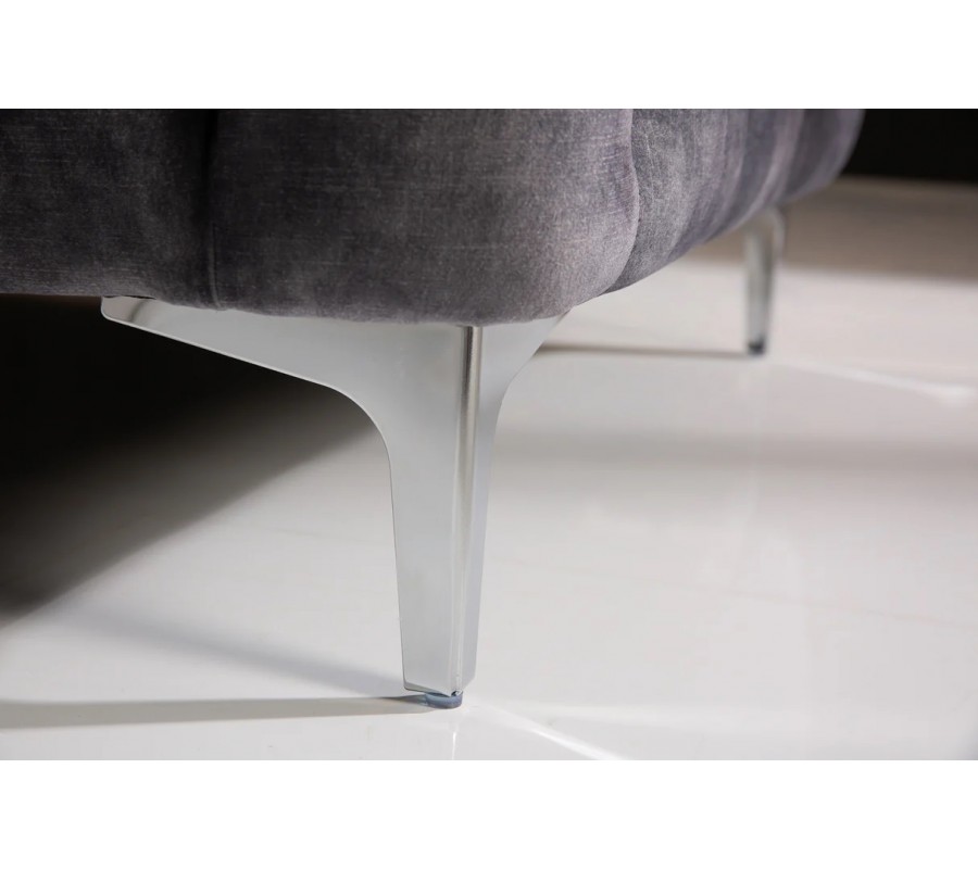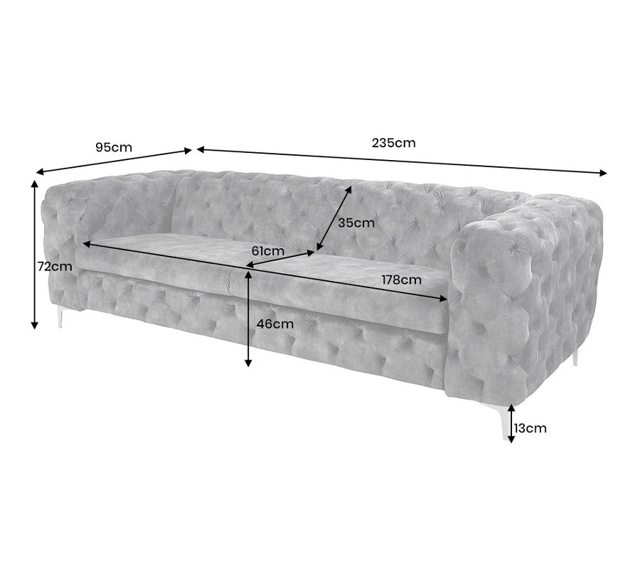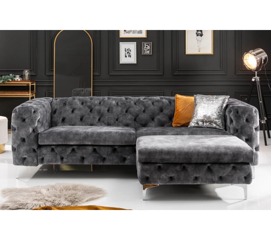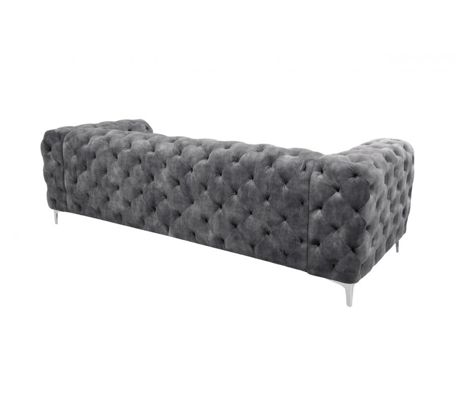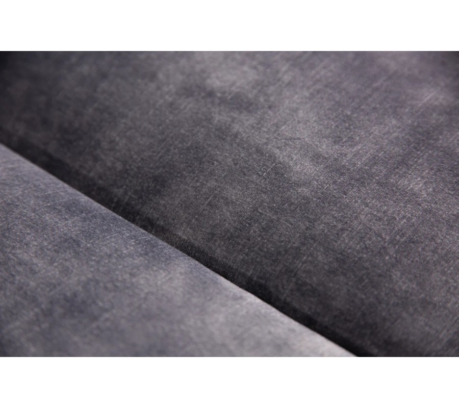 Celý povrch sedačky je potažen jemným sametovým potahem v tmavě šedé barvě, který působí mimořádně elegantně, je příjemný na dotek a dodává prostoru luxusní atmosféru. Charakteristické chesterfield prošívání pokrývá opěradlo, boční části i čelní plochu sedačky, čímž vytváří bohatou strukturu a nadčasový vzhled inspirovaný klasickým barokním stylem v moderním zpracování.