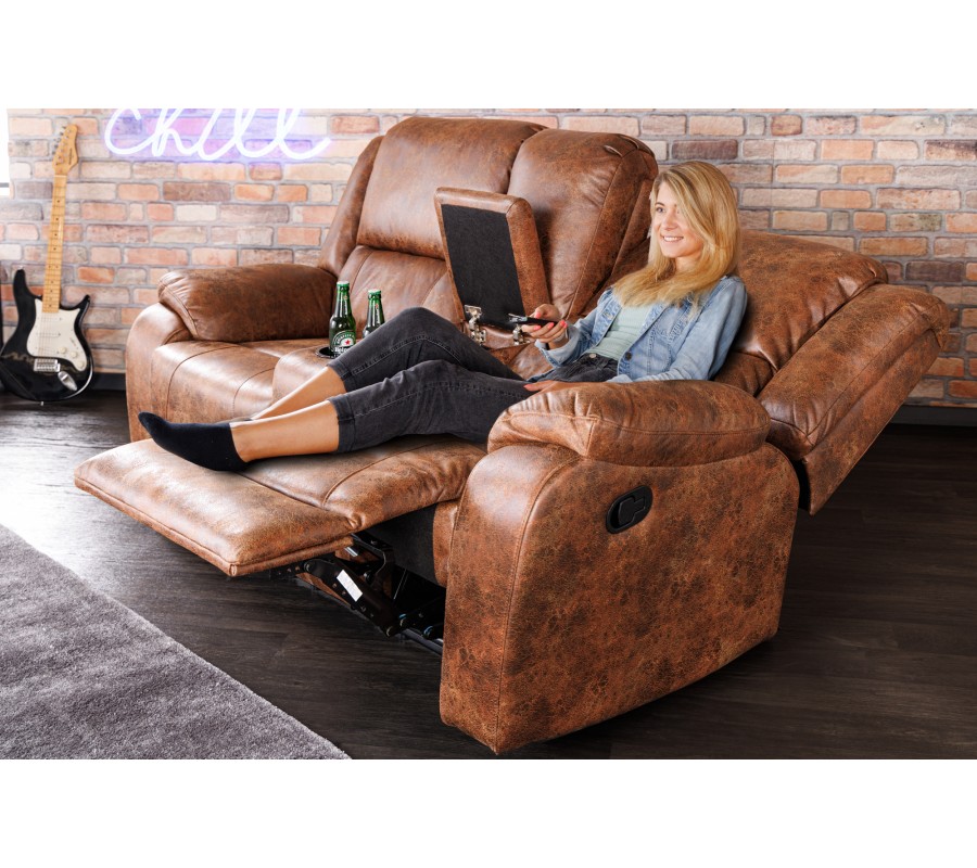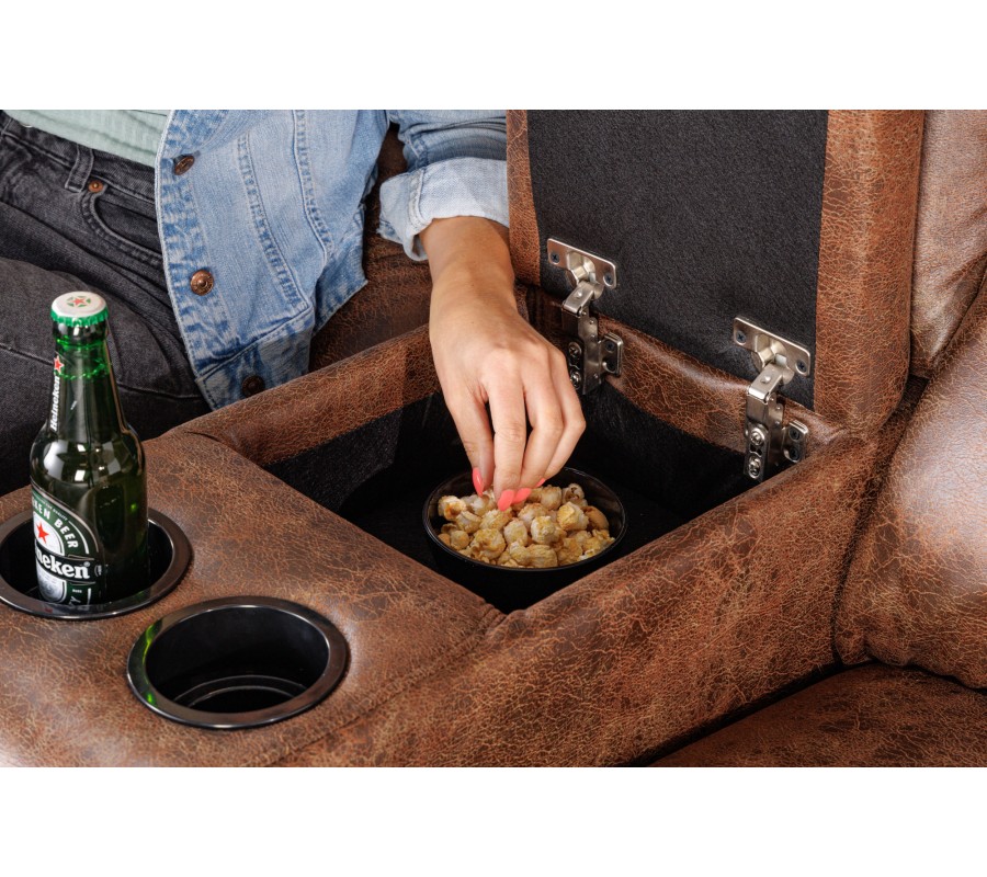 Domácí kinosedačka Phoenix vám dá možnost užít si domácí filmové večery v maximálním pohodlí. Mezi dvěma polohovatelnými sedačkami se nachází široká opěrka s držáky na dvě sklenice a uzavíratelným úložným prostorem. Na boční straně je umístěna páčka, kterou můžete sedadla zvedat a sklápět. Stylové čalounění z ekokůže dodává sedačce vintage efekt. Tento design spolu s masivním tvarem vytváří dojem útulnosti a domáckosti. Na sedačku se vejdou dvě osoby, každé sedadlo má nosnost 120 kg a sedací plochu ve velikosti 53x53 cm. Pokud si zařizujete domácí kino místnost, můžete ji doplnit tmavými stěnami a tmavým kobercem. Dosáhnete tak autentický pocit kinosálu ve spojení s pohodlím vaší domácnosti. Sedačka si však najde místo iv obýváku. Můžete ji doplnit výrazným vintage kusem, který se bude hodit k potahu nebo dřevěným nábytkem s teplými tóny. Tato kombinace vytvoří útulný pocit domova.