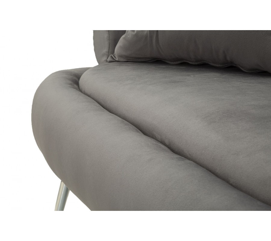 Textilní potah má sametovou strukturu s jemným leskem a jeho šedá barva výborně koresponduje s lesklým chromovým provedením nožiček. Ty jsou vyrobeny z kovu a mají elegantní, na spodní části zúžený tvar a sešikmenou linii.