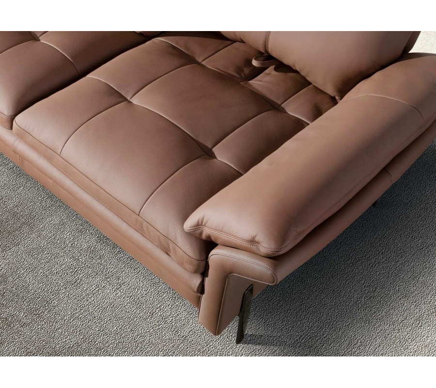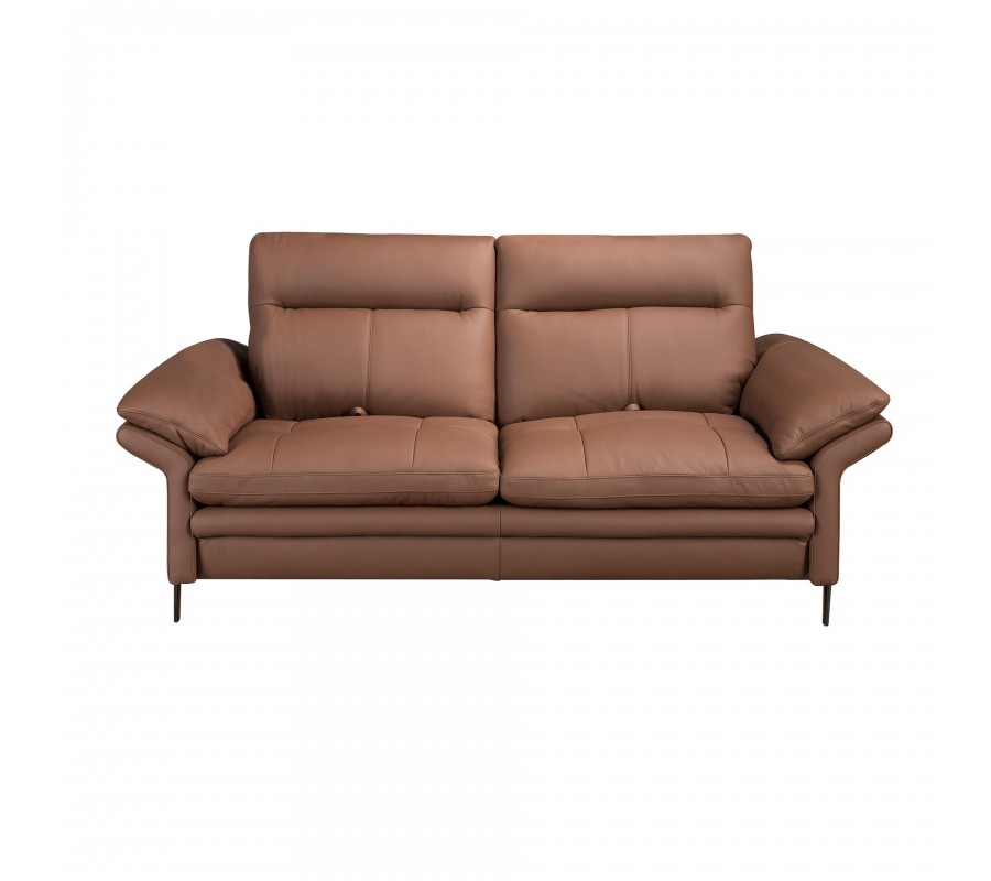 Pevný rám z masivního dřeva pokrývá pěnová výplň a potah z pravé kůže, který zdobí na sedací části prošívání se čtvercovým vzorem typu capitone, a na opěrkových polštářích minimalistické prošívání ve tvaru T. Potah má naturální teplou hnědou barvu a hladký, na dotek příjemný povrch.