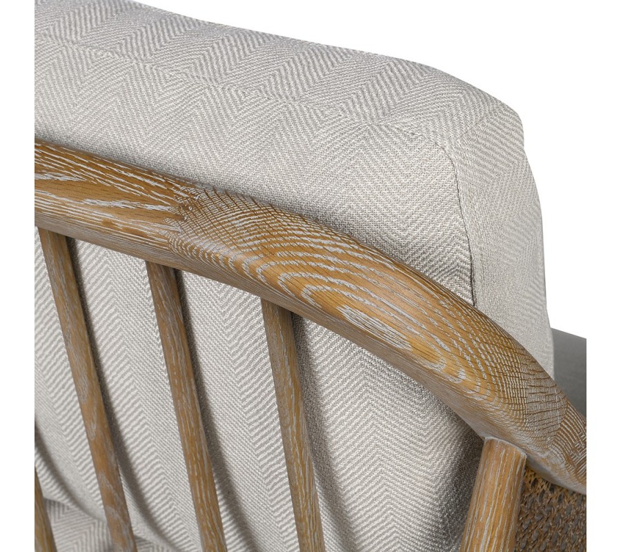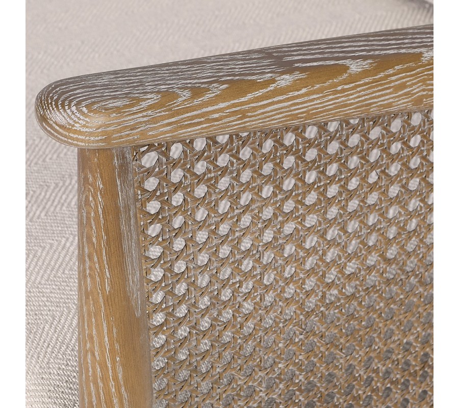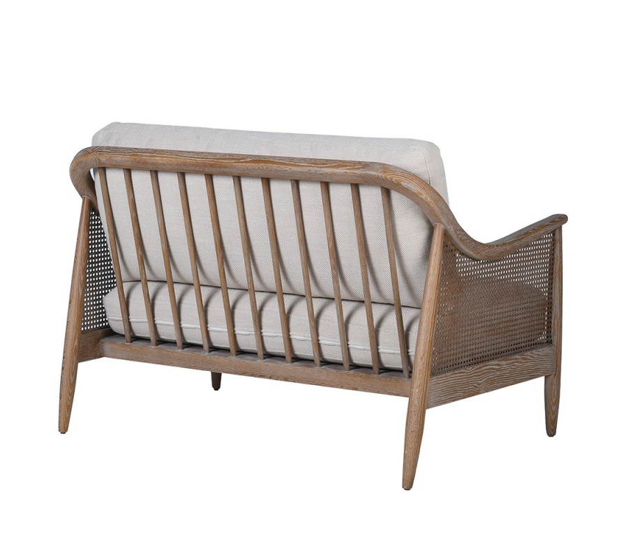 Boční strany zdobí vídeňský výplet, který přináší lehkost a vzdušnost do celkového designu. Ze zadní strany je sedačka řešená soustavou jedenácti plochých dřevěných prutů, které tvoří oporu pro opěradlový polštář a zároveň vizuálně navazují na boční výplet. Tento detail dělá ze sedačky nejen funkční, ale také dekorativní prvek interiéru.