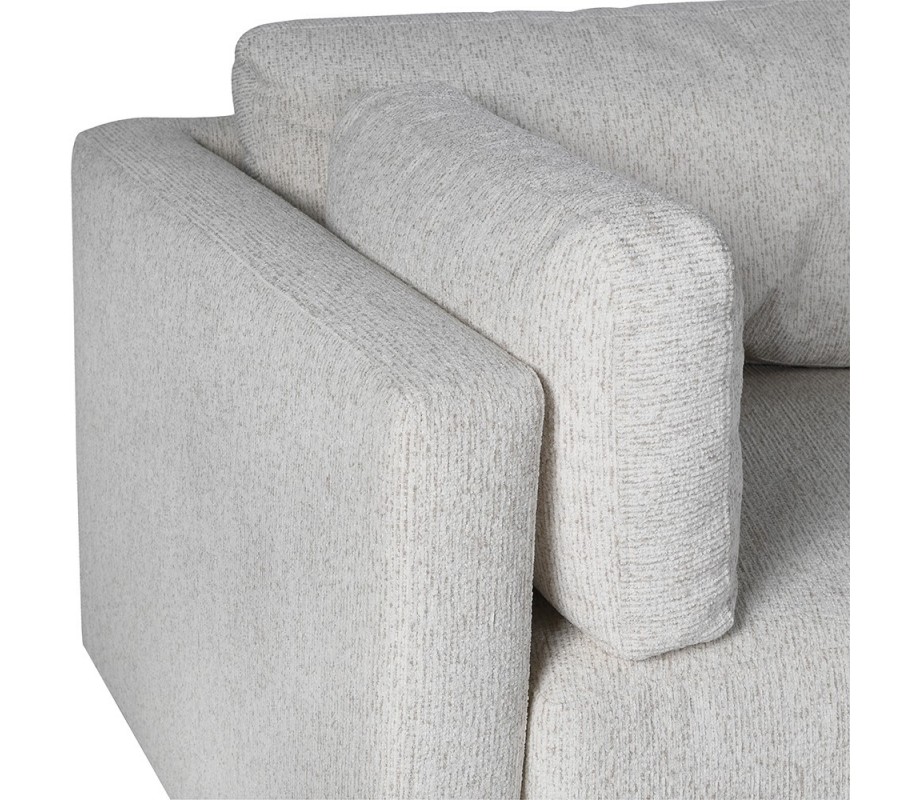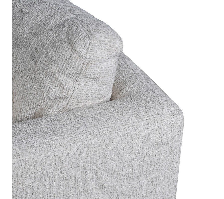 Sedačka má pevnou konstrukci z kombinace masivního a dýhovaného dřeva. Pokrývá ji pěnová výplň, zaručující maximální komfort a potah z mikrovlákna, který je pevný a odolný. Textilie má lineární strukturu, která je příjemná na dotek. V kombinaci s čistým bílým provedením moderní design oživí, ale zároveň zdůrazní jeho minimalistický charakter.