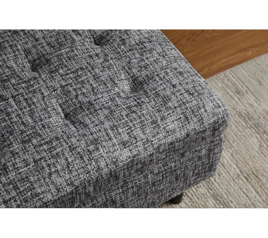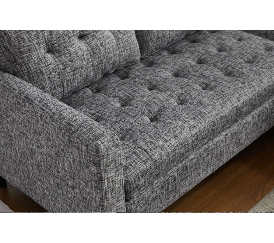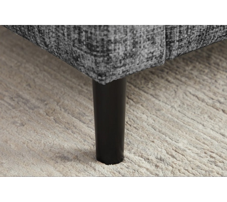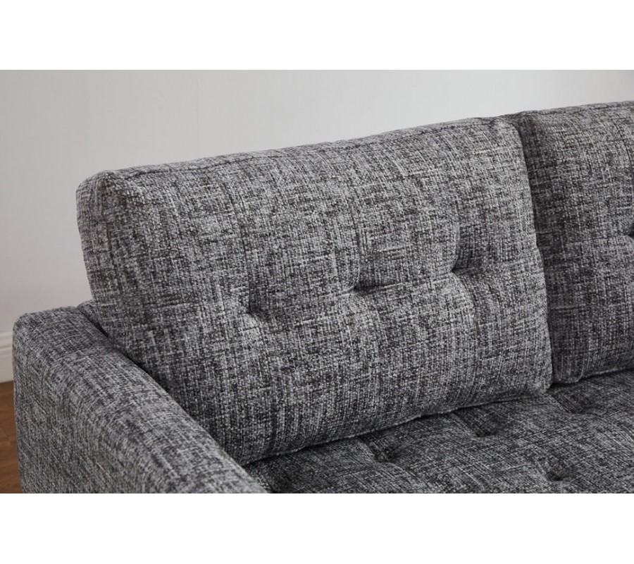 Sedačka má pevný dřevěný rám, pěnové čalounění a pružinové jádro, které zaručuje výbornou pevnost a dlouhodobou odolnost vůči vlivům každodenního používání. Potah je vyroben z mikrovlákna. Textilie je díky výraznému tkaní příjemná na dotek a zároveň nenáročná na údržbu. Kombinace vlákna v tmavším a světlejším šedém odstínu vytváří elegantní melírovaný efekt, diskrétně doplněný černou barvou nožiček.