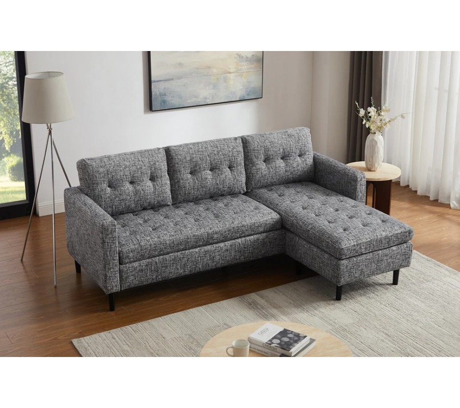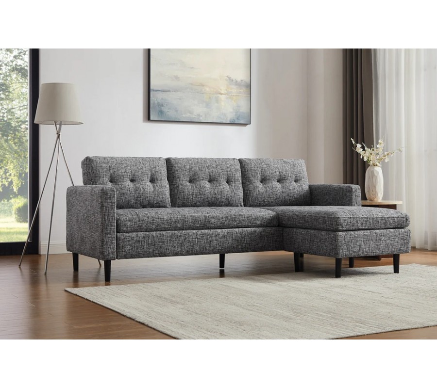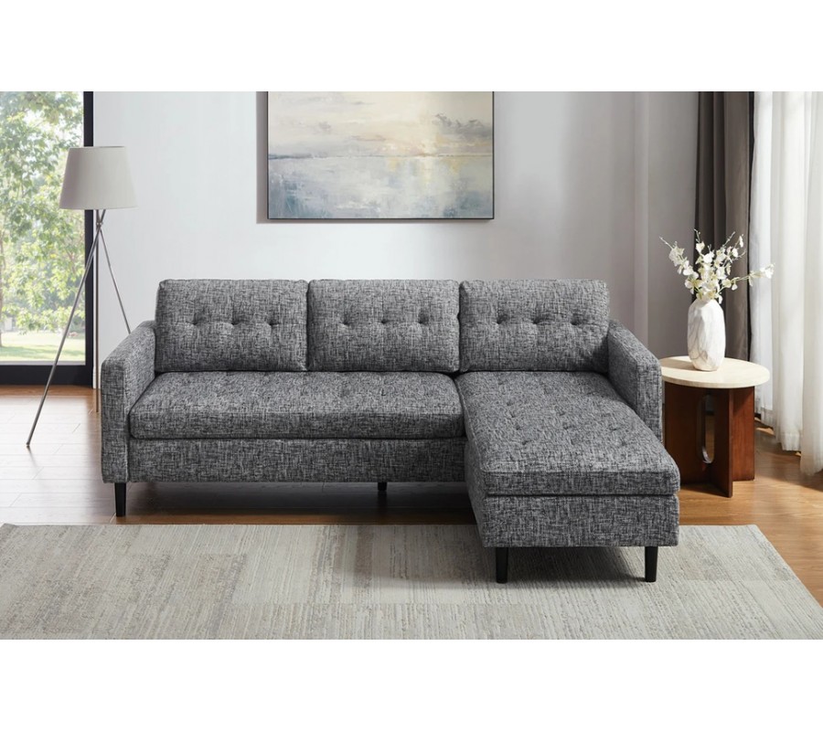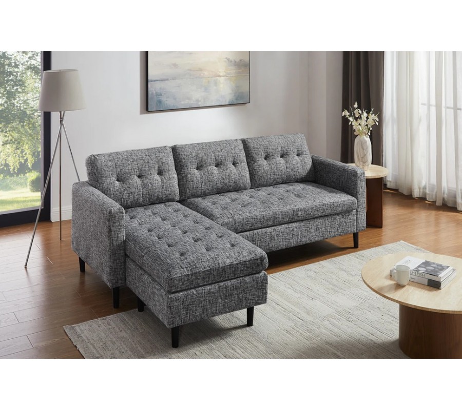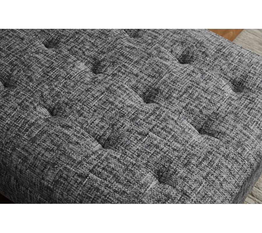 Sedačka má pevný dřevěný rám, pěnové čalounění a pružinové jádro, které zaručuje výbornou pevnost a dlouhodobou odolnost vůči vlivům každodenního používání. Potah je vyroben z mikrovlákna. Textilie je díky výraznému tkaní příjemná na dotek a zároveň nenáročná na údržbu. Kombinace vlákna v tmavším a světlejším šedém odstínu vytváří elegantní melírovaný efekt, diskrétně doplněný černou barvou nožiček.