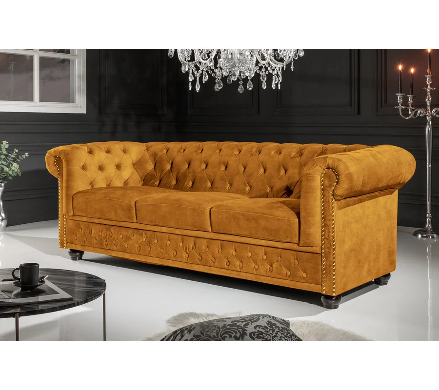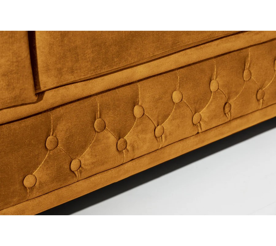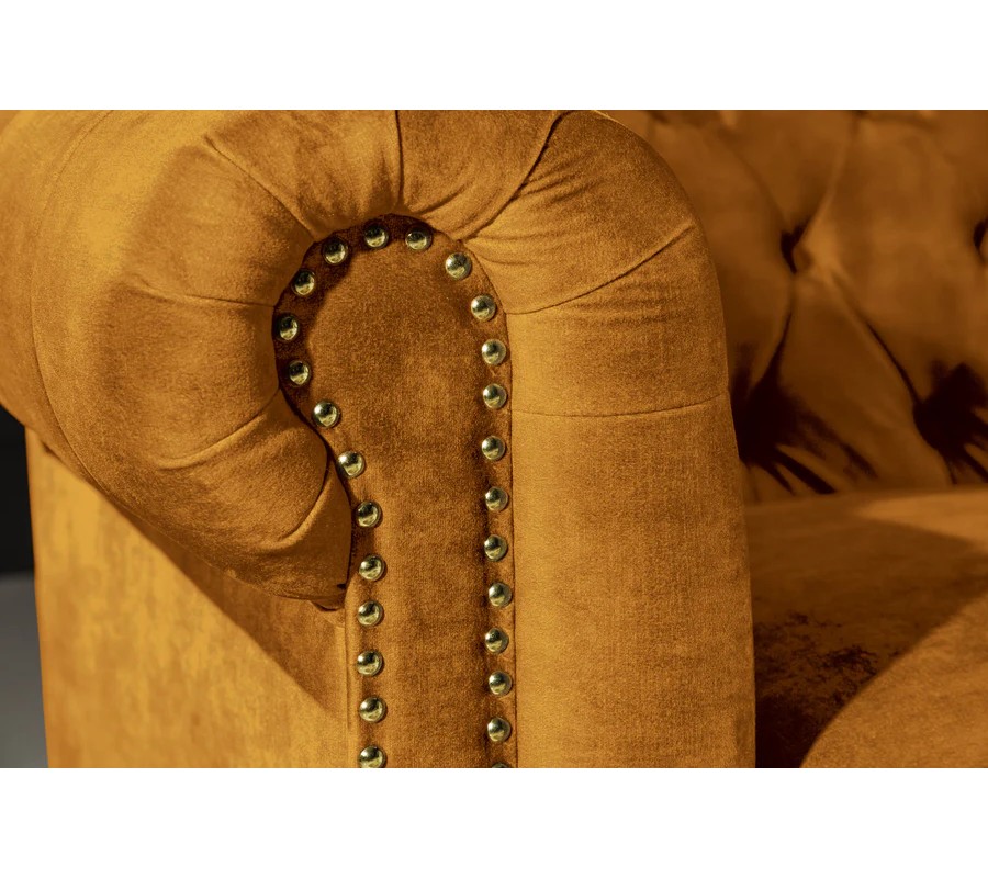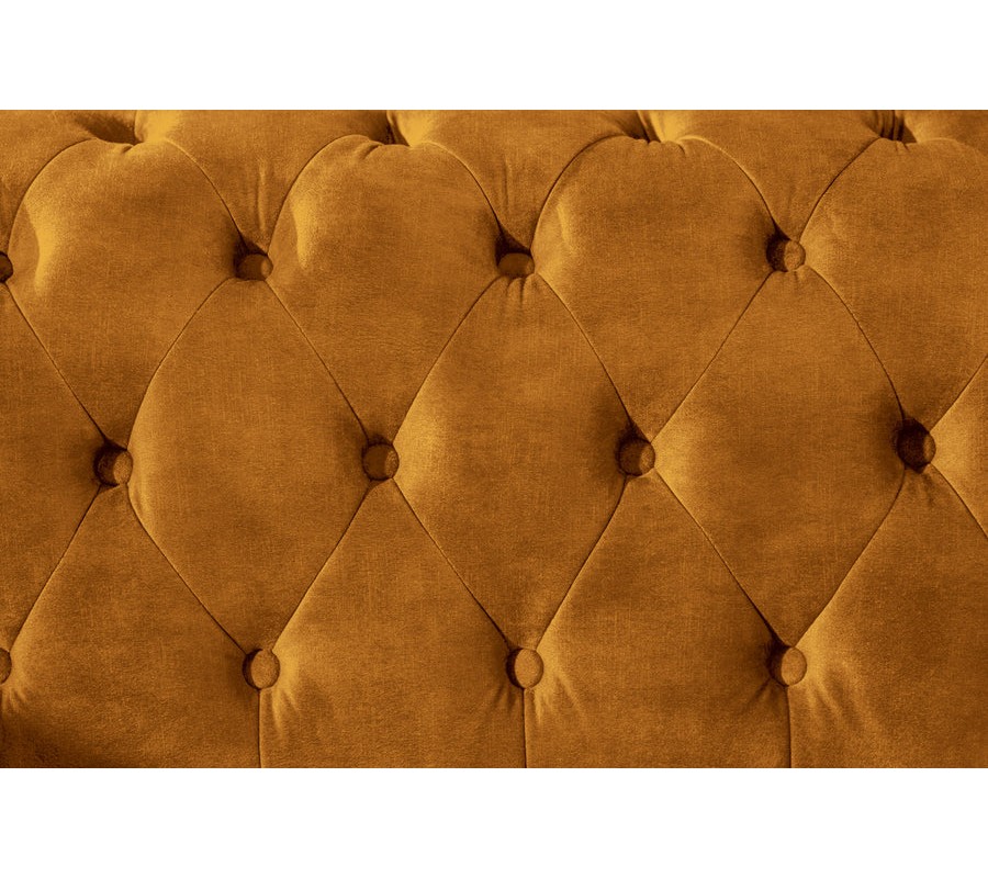 Designová sedačka Maya přinese do interiéru jedinečný vzhled s důrazem na eleganci, styl a jemný historický nádech, který je pro chesterfield nábytek typický. Je potažena sametovou textilií v hořčicové barvě, která působí teplo a výrazně. Hebká struktura sametu dodává celku hloubku a vizuálně zjemňuje mohutné linie sedačky.