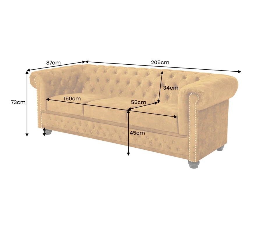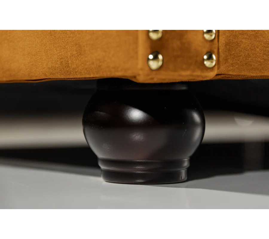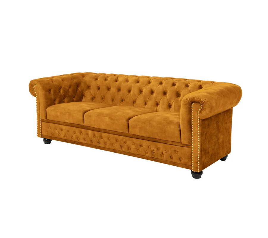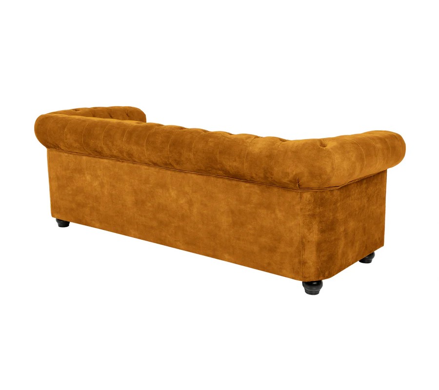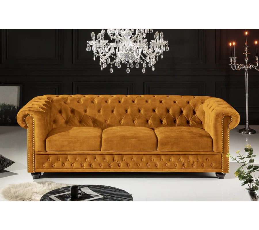 Designová sedačka Maya přinese do interiéru jedinečný vzhled s důrazem na eleganci, styl a jemný historický nádech, který je pro chesterfield nábytek typický. Je potažena sametovou textilií v hořčicové barvě, která působí teplo a výrazně. Hebká struktura sametu dodává celku hloubku a vizuálně zjemňuje mohutné linie sedačky.