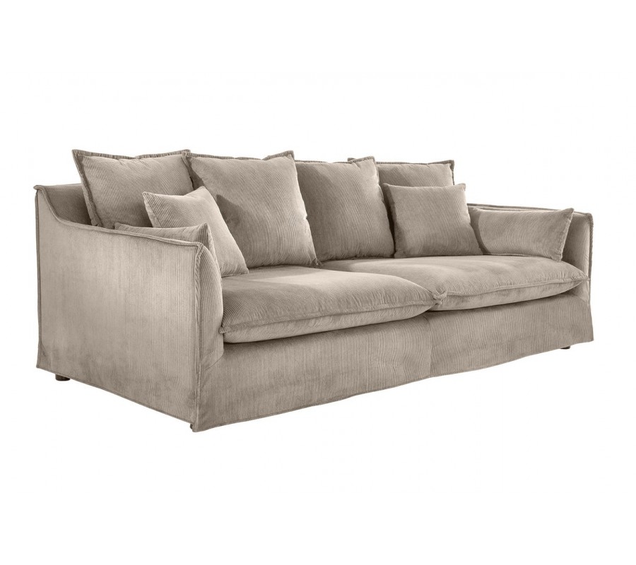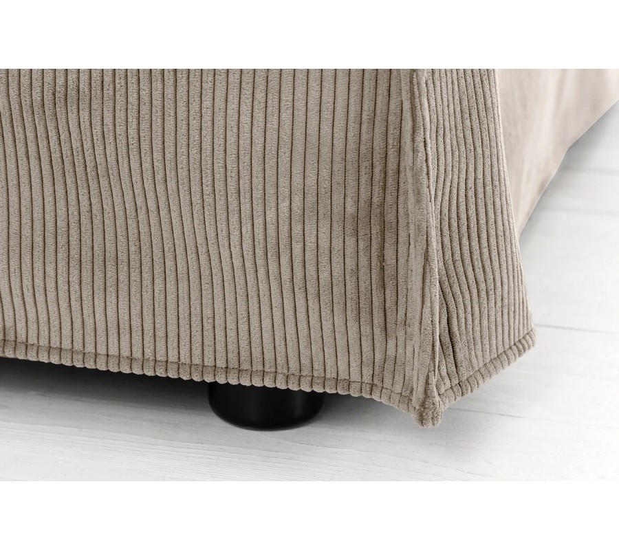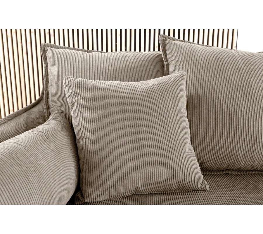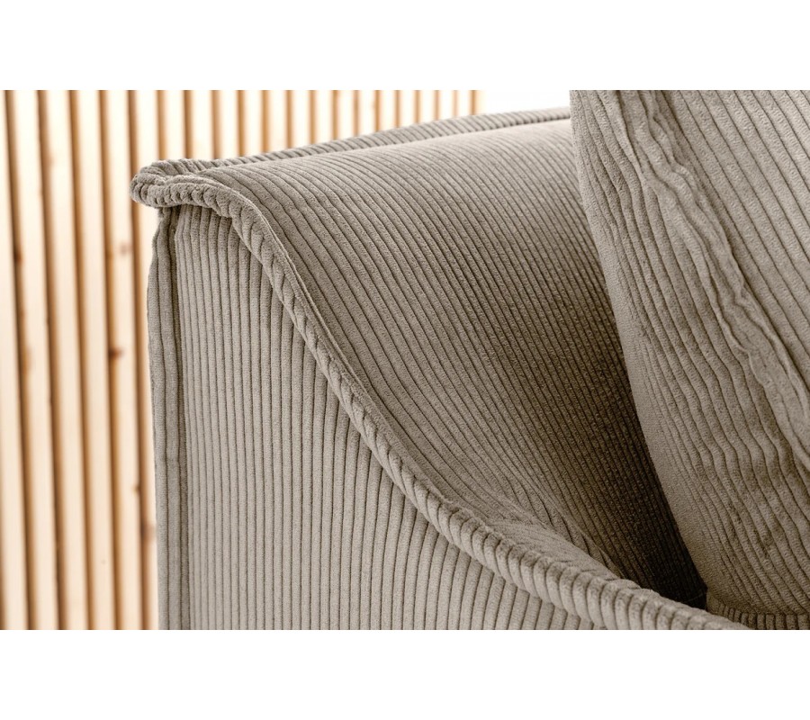 Sedačka má mohutnou siluetu, doplněnou ve spodní části o nízké černé válcovité nožičky. Potah je vyroben z mikrovlákna, které je mimořádně odolné vůči vlivům každodenního používání a je také odnímatelný, což usnadňuje údržbu. Textilie je příjemná na dotek a lineární manšestrová struktura působí útulným dojmem. Světlá béžová barva je elegantní a snadno se kombinuje s dalším nábytkem.