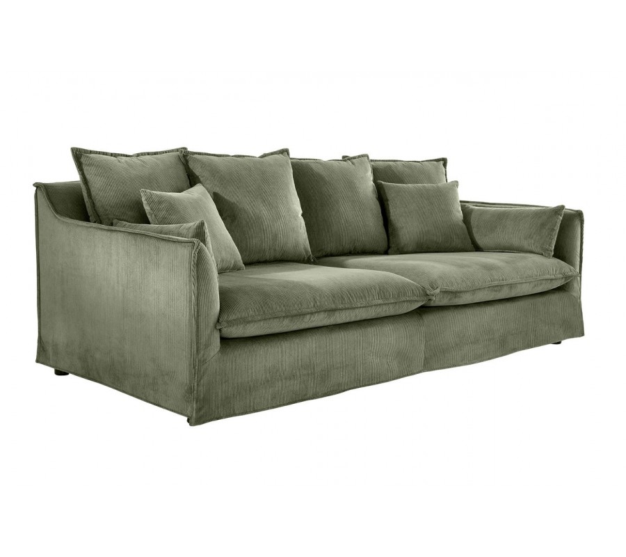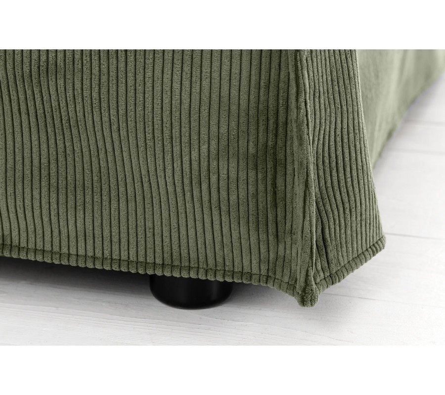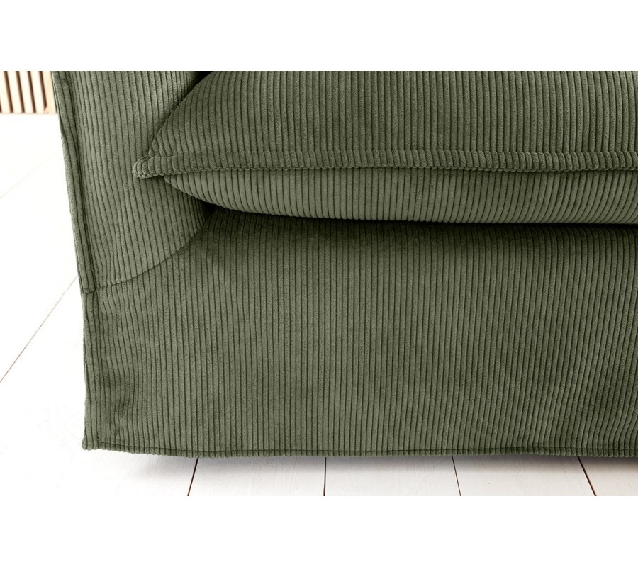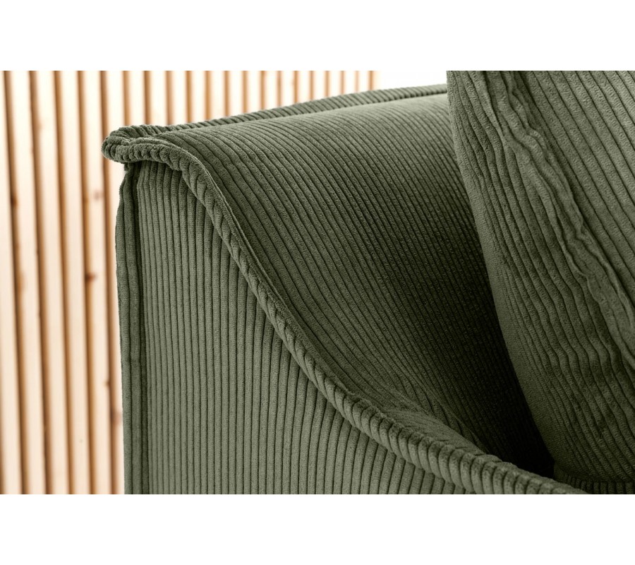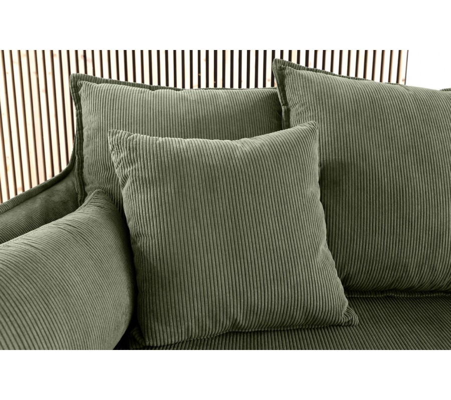 Samotná sedačka i polštáře jsou vyrobeny ve stejném manšestrovém provedení v šalvějové zelené barvě. Lineární struktura látky působí útulným dojmem a okraje polštářů a opěrky zdobí výrazné šití, podtrhující měkký vizuál. Potah je odnímatelný, což usnadňuje čištění a údržbu nábytku.