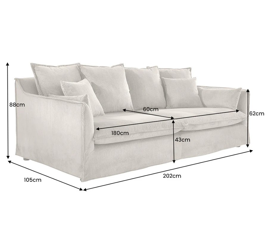 Sedačka má moderní siluetu s obdélníkovým sedadlem, doplněným o dva sedací polštáře. Zádová opěrka je rovná a na bocích přechází v elegantní křivce do nižších opěrek na ruce. Maximální komfort poskytnou čtyři větší a dva menší čtvercové opěrkové polštáře a dodatečné dva obdélníkové polštáře.