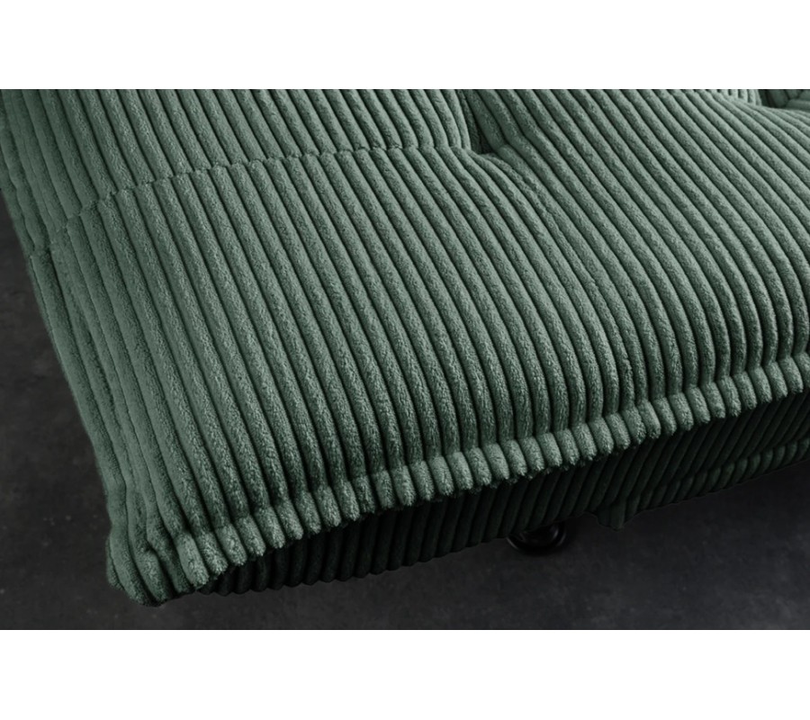 Potah tvoří manšestrová látka v tlumeném zeleném odstínu, která působí měkce, hřejivě a vizuálně zajímavě. Opěradlo je členěno prošíváním do čtvercového vzoru, což dodává sedačce strukturu a charakter. Dekorativní prošívání lemu po obvodu sedací i opěradlové části zvýrazňuje precizní zpracování a dotváří moderní vzhled. Součástí jsou dva obdélníkové polštáře, které zvyšují pohodlí a umožňují variabilní opření.