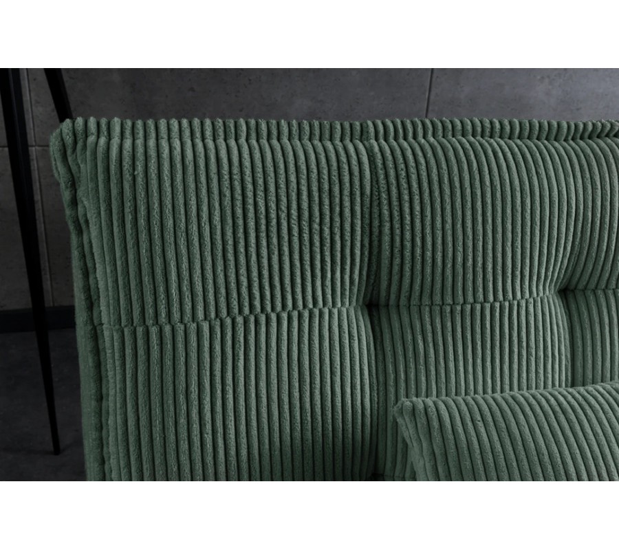 Potah tvoří manšestrová látka v tlumeném zeleném odstínu, která působí měkce, hřejivě a vizuálně zajímavě. Opěradlo je členěno prošíváním do čtvercového vzoru, což dodává sedačce strukturu a charakter. Dekorativní prošívání lemu po obvodu sedací i opěradlové části zvýrazňuje precizní zpracování a dotváří moderní vzhled. Součástí jsou dva obdélníkové polštáře, které zvyšují pohodlí a umožňují variabilní opření.