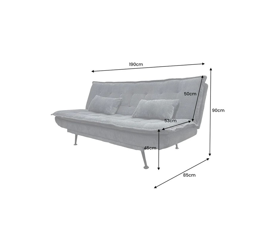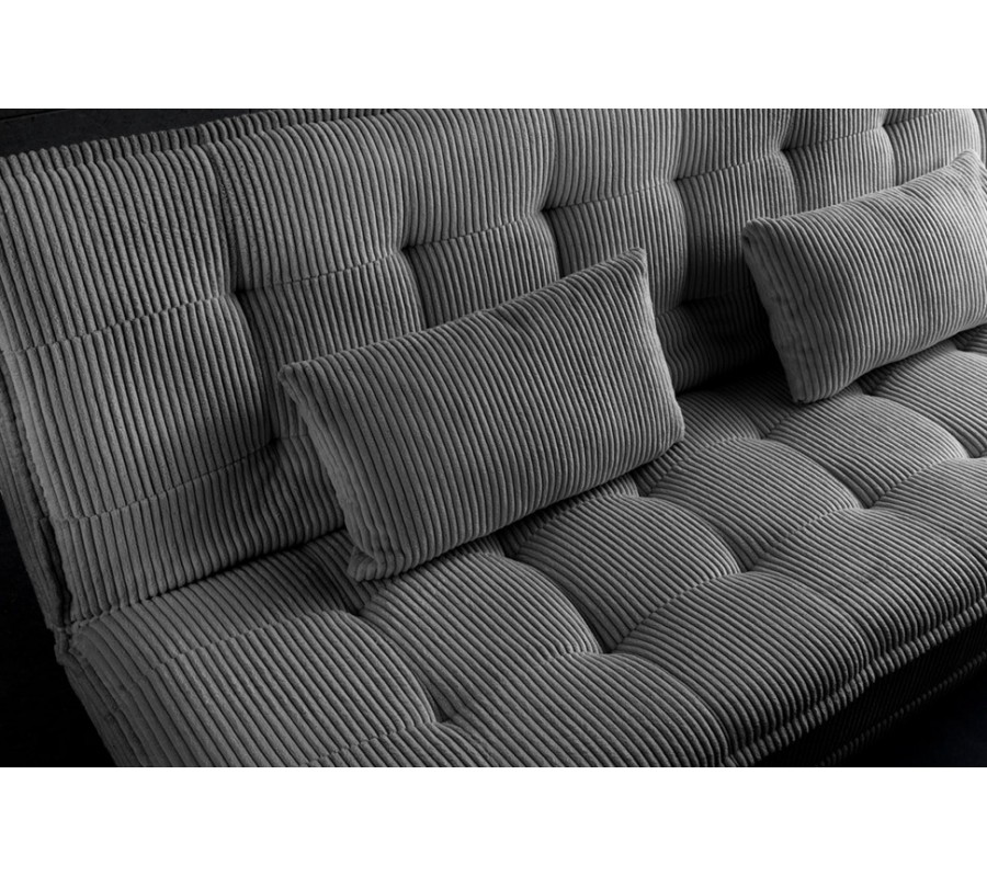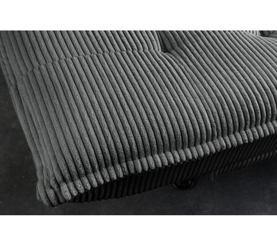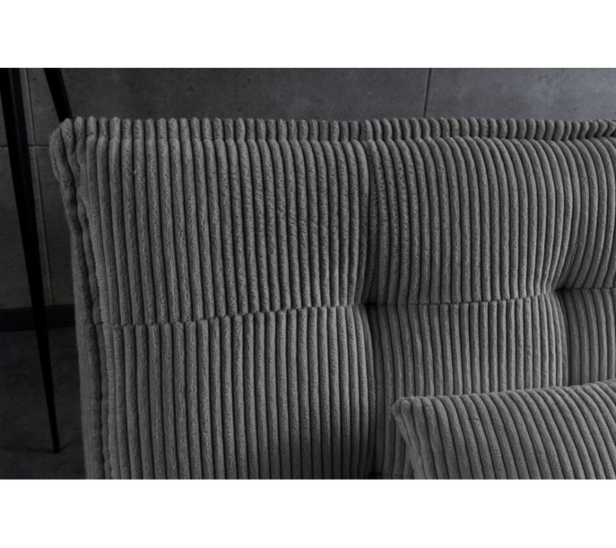 Čalounění tvoří manšestrová látka v tmavě šedém odstínu, která dodává sedačce hloubku, decentní kontrast a nadčasový charakter. Opěradlo je zdobeno pravidelným prošíváním do čtvercového vzoru, které vizuálně člení plochu a zvyšuje estetickou hodnotu sedačky. Prošívaný lem po obvodu sedací i opěradlové části podtrhuje precizní zpracování a designovou čistotu. Součástí jsou dva obdélníkové polštáře, které zvyšují pohodlí a umožňují individuální nastavení opory.