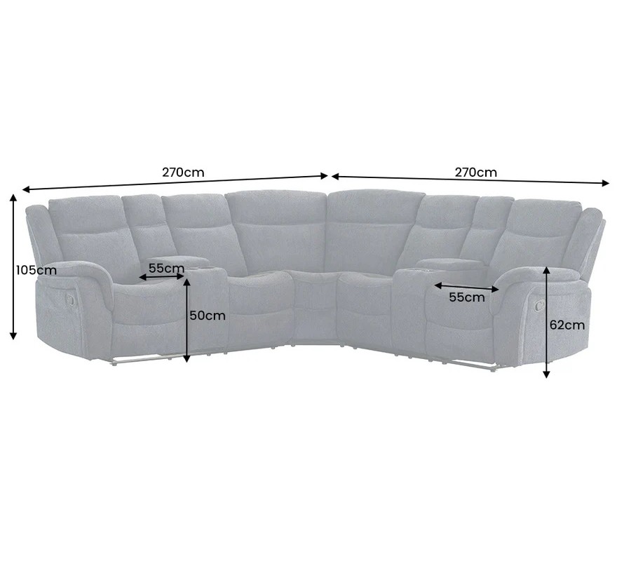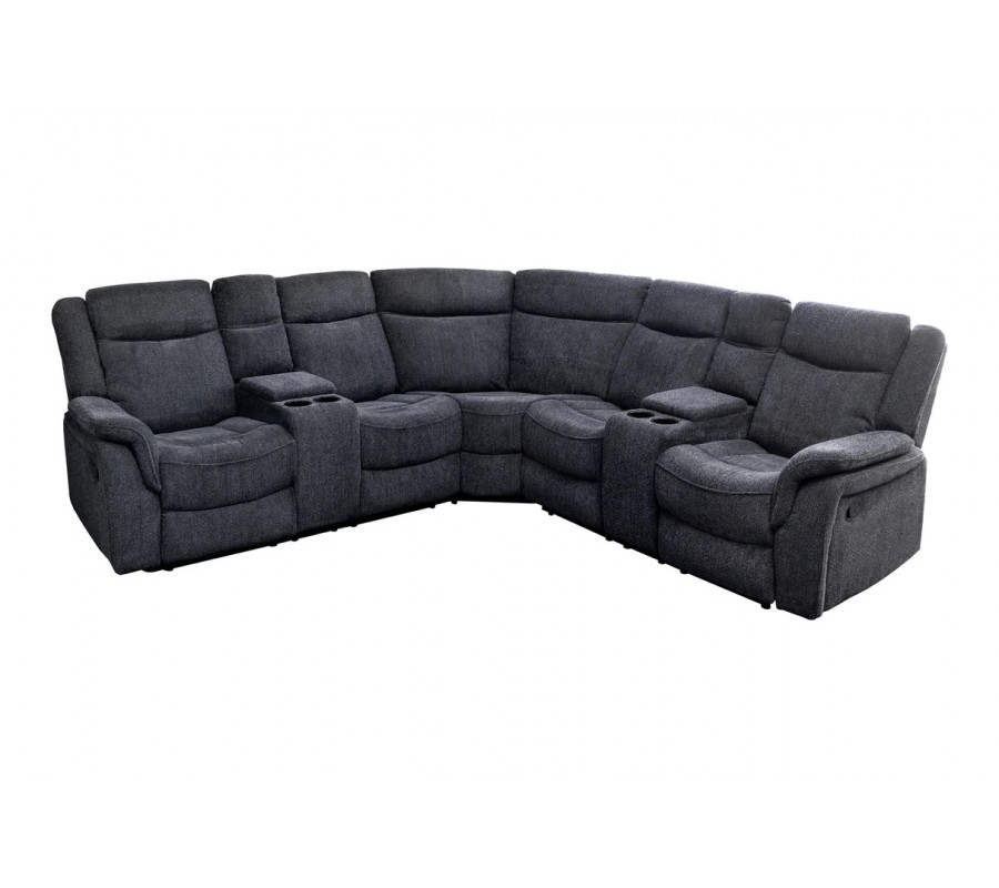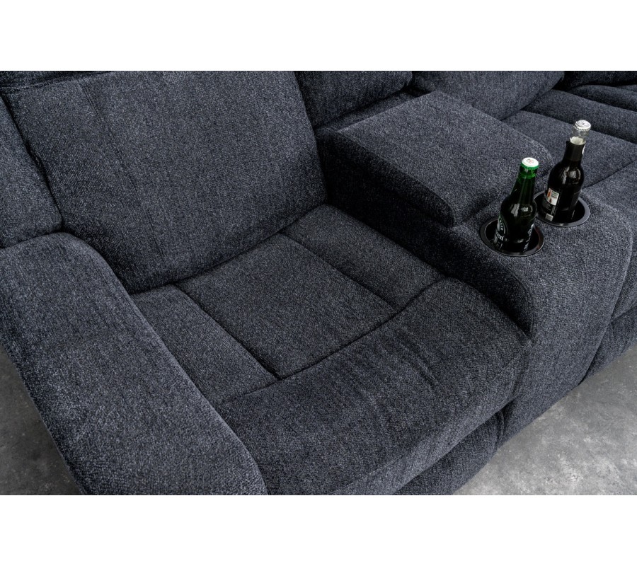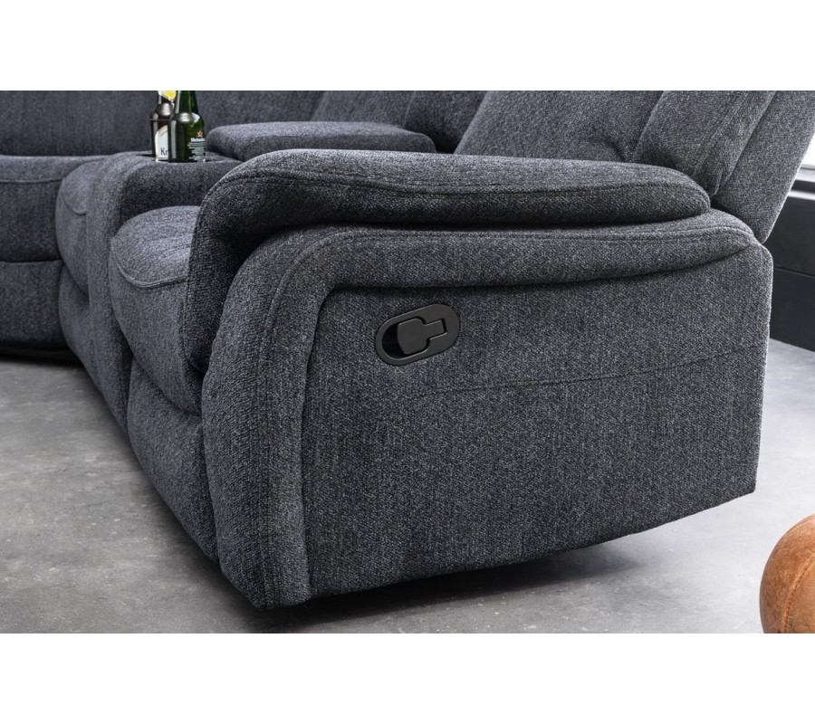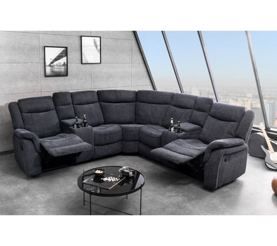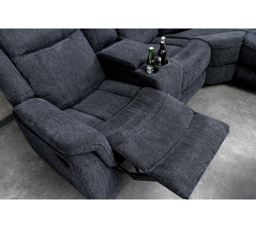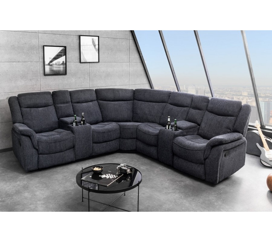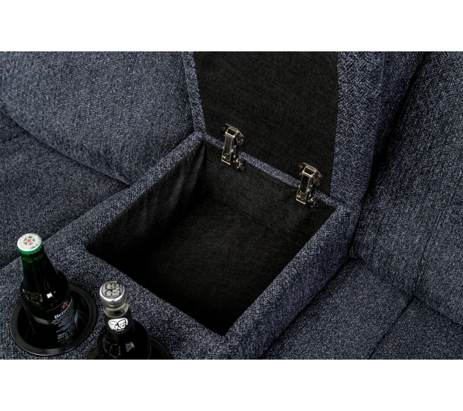 Každé z bočních křesel disponuje dvěma držáky na sklenice, umístěnými v otevíracích loketních opěrkách, které zvyšují praktičnost a pohodlí při relaxu. Sedačka je bohatě čalouněná, s důrazem na měkkost a oporu zad i rukou, díky čemuž poskytuje vysokou míru komfortu i při delším sezení. Šedý textilní potah je příjemný na dotek, působí moderně a nad.
