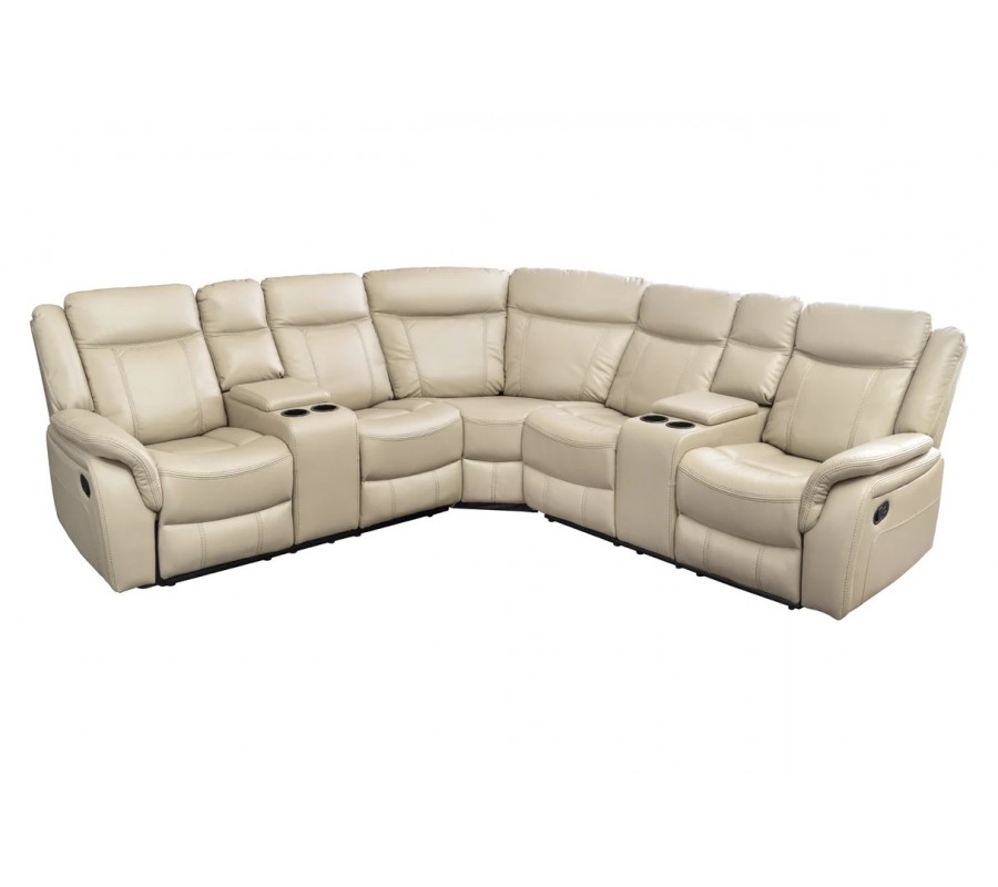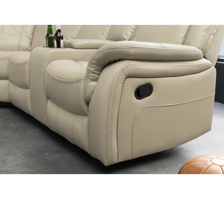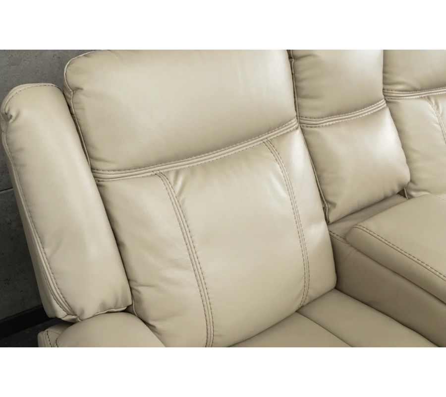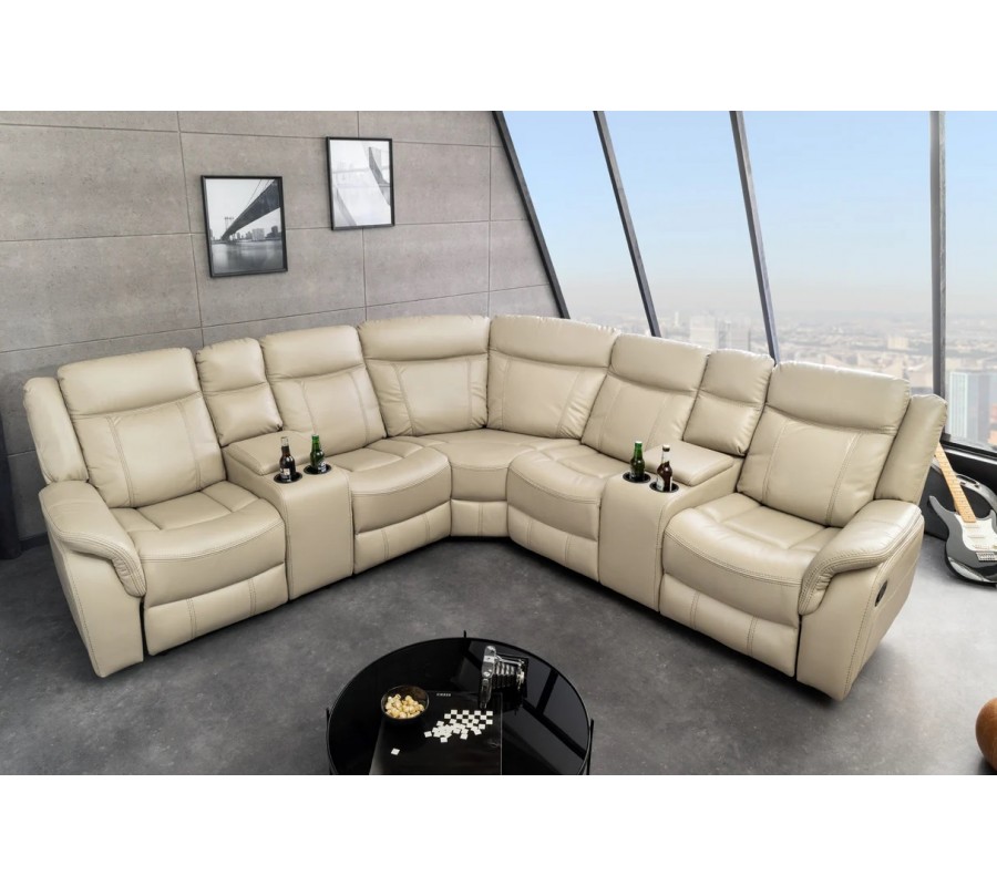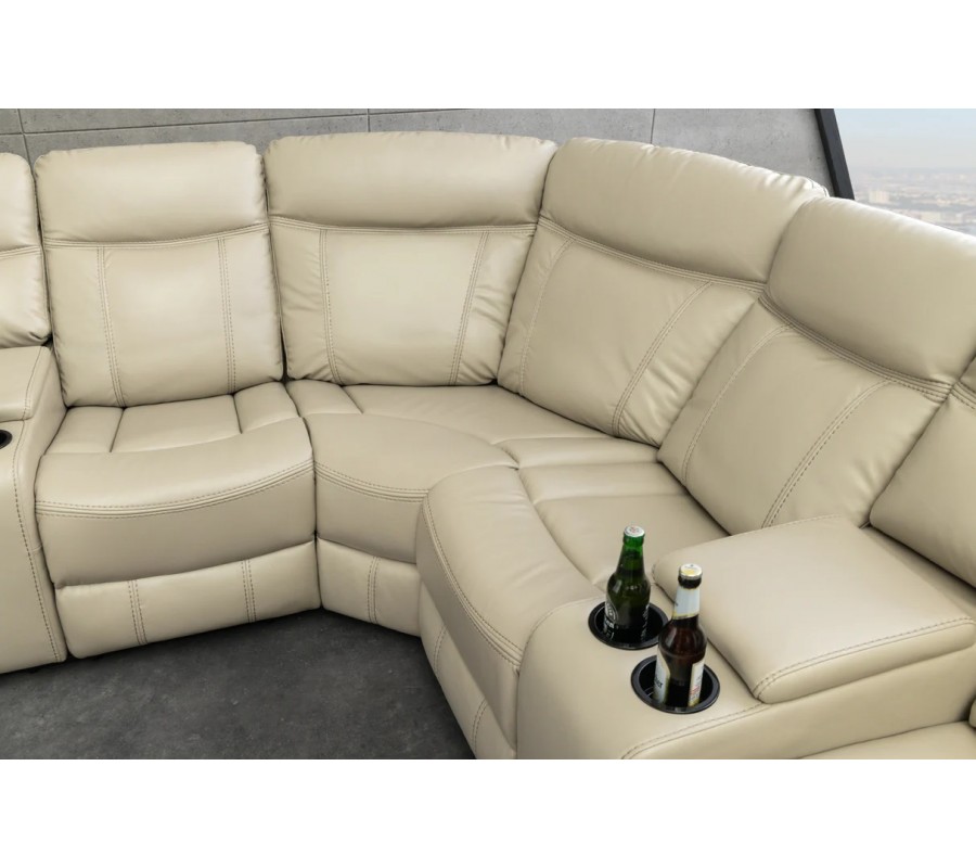 Každé z bočních křesel disponuje otevíracími loketními opěrkami s integrovanými držáky na sklenice, které zvyšují praktičnost a pohodlí při používání. Sedačka je bohatě čalouněná, s měkkým sedákem, vysokým opěradlem a pohodlnými opěrkami rukou, což zajišťuje vysokou míru komfortu i při delším sezení. Eko-kožený potah v béžové barvě působí elegantně, luxusně a zároveň je příjemný na dotek a nenáročný na údržbu.