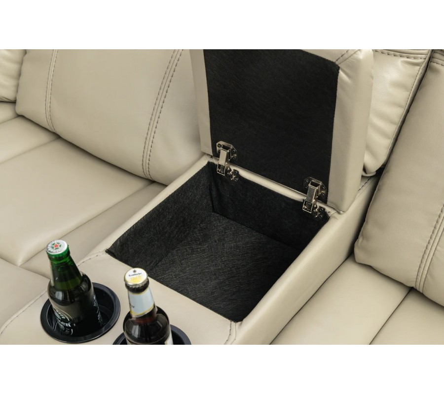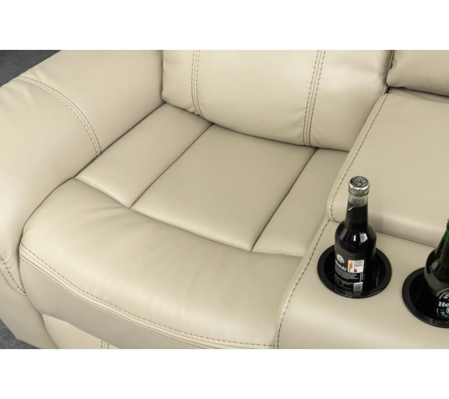 Každé z bočních křesel disponuje otevíracími loketními opěrkami s integrovanými držáky na sklenice, které zvyšují praktičnost a pohodlí při používání. Sedačka je bohatě čalouněná, s měkkým sedákem, vysokým opěradlem a pohodlnými opěrkami rukou, což zajišťuje vysokou míru komfortu i při delším sezení. Eko-kožený potah v béžové barvě působí elegantně, luxusně a zároveň je příjemný na dotek a nenáročný na údržbu.