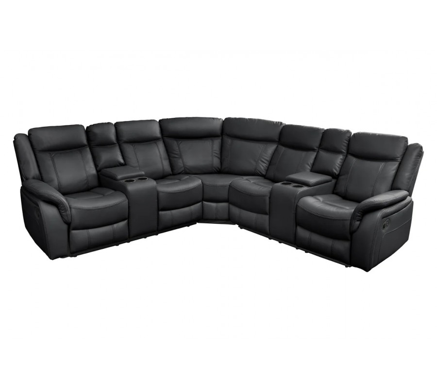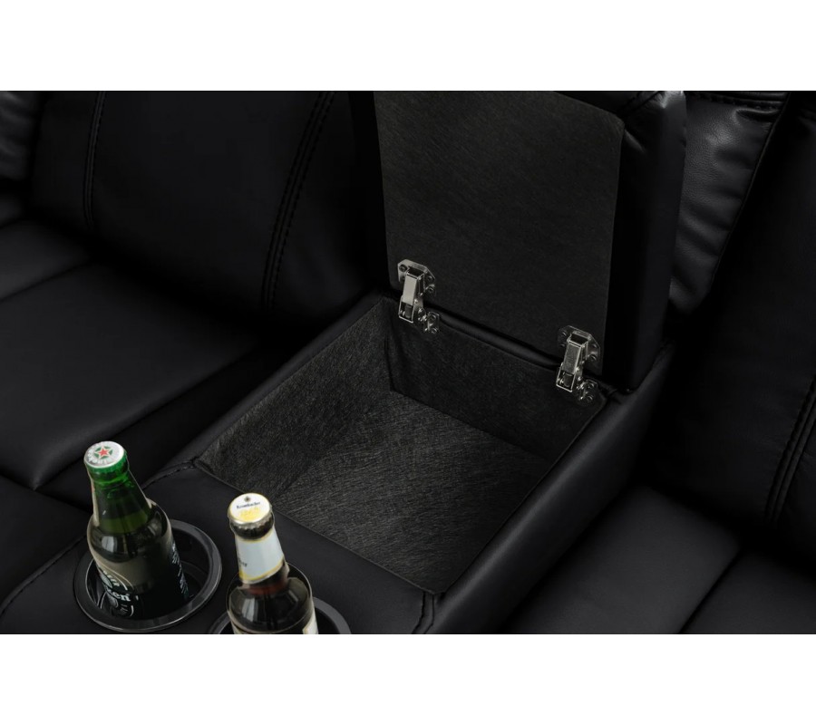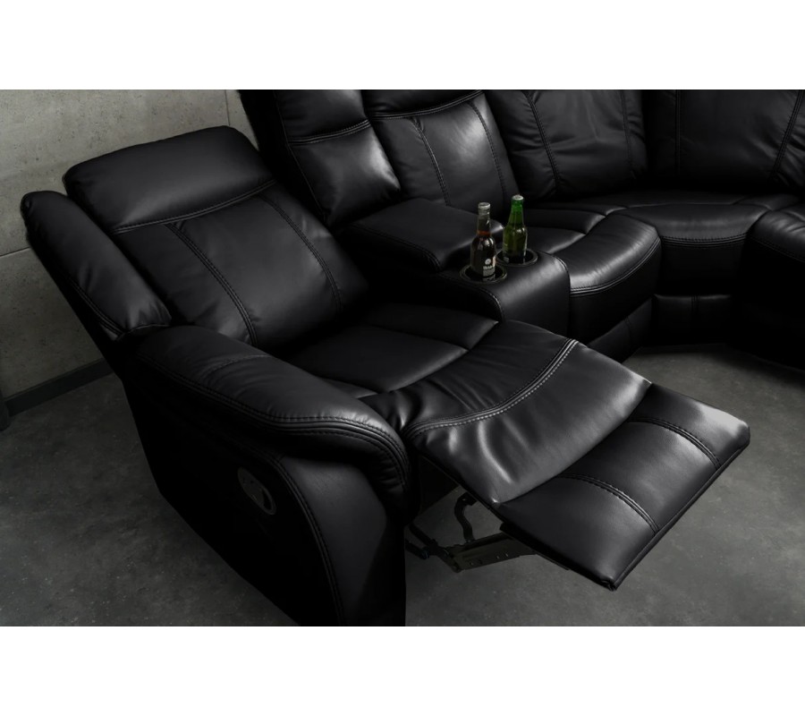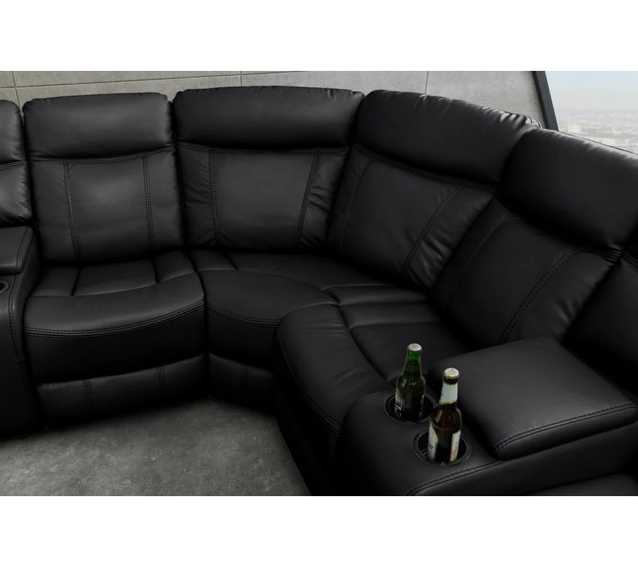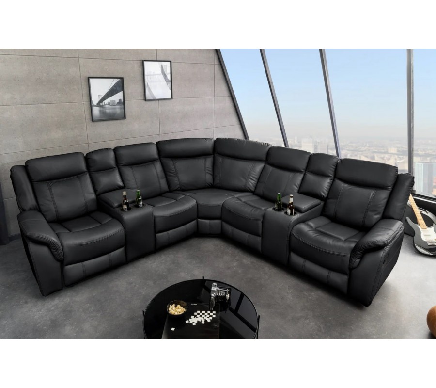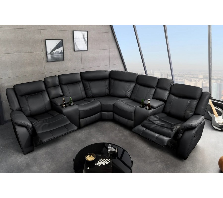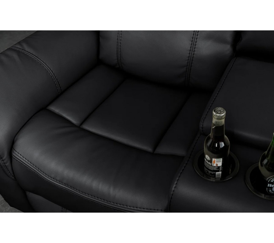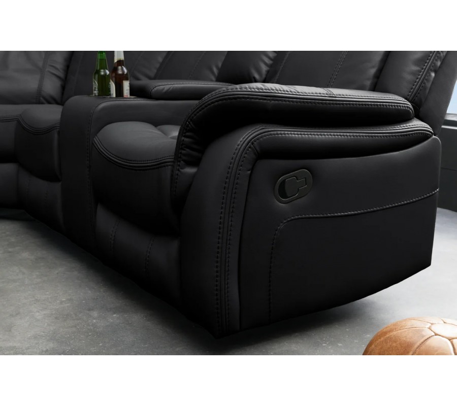 Každé z bočních křesel disponuje otevíracími loketními opěrkami s integrovanými držáky na sklenice, což výrazně zvyšuje komfort při sledování filmů či odpočinku. Sedačka je bohatě čalouněná, s měkkými sedáky, vysokými opěradly a pohodlnými područkami, které poskytují výbornou oporu i při delším sezení. Eko-kožený potah v černé barvě působí elegantně, moderně a nadčasově, zároveň je příjemný na dotek a nenáročný na údržbu.