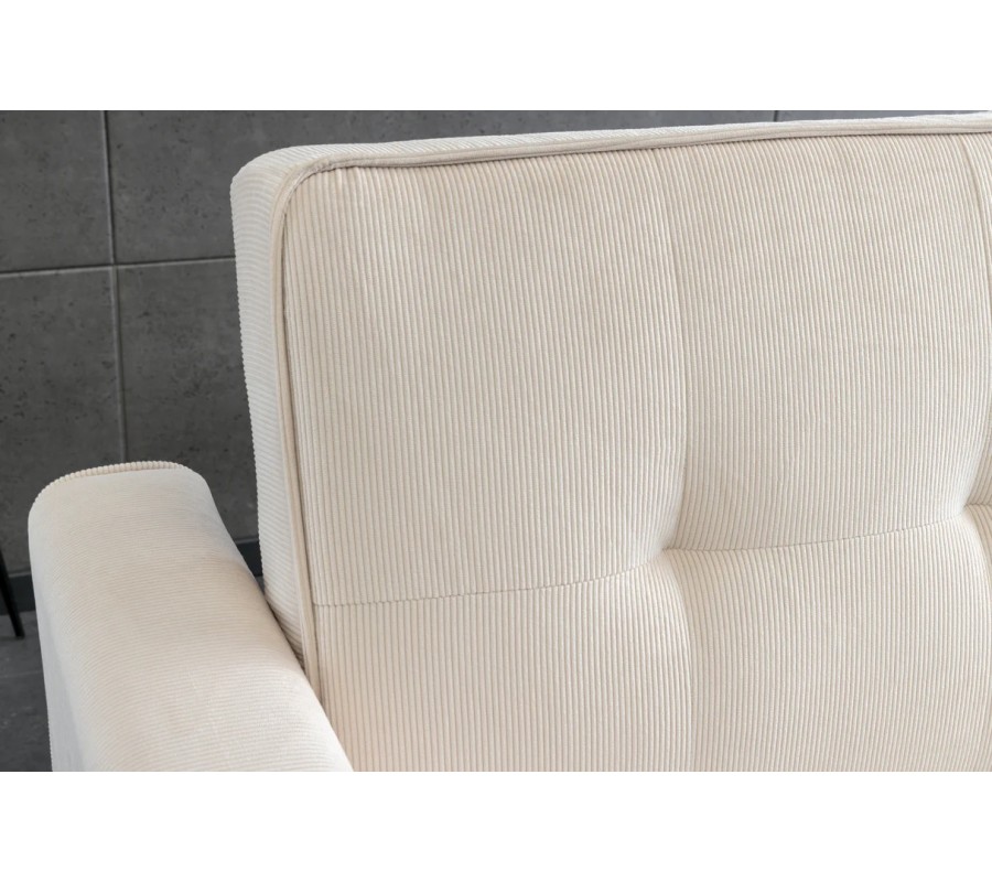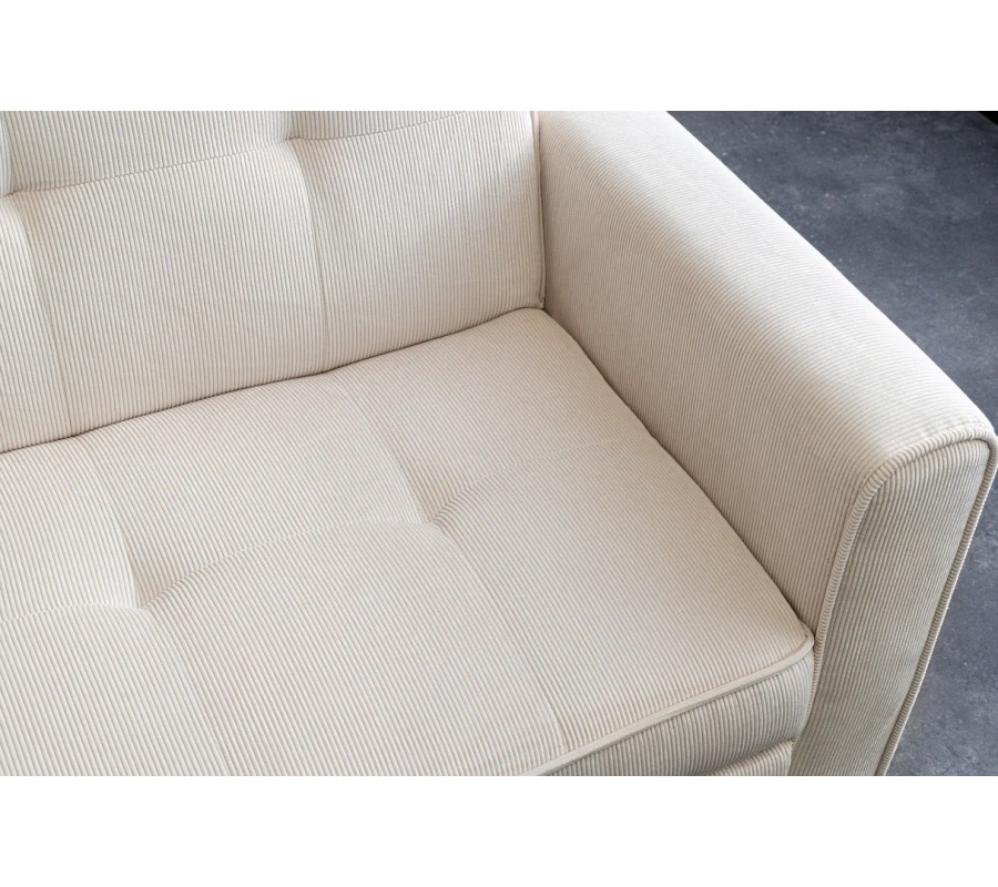 Sedačka je čalouněna manšestrovým potahem v béžovém odstínu, který působí hřejivě, jemně a nadčasově. Sedací část i zádová opěrka jsou prošívané do čtvercového vzoru, který dodává sedačce elegantní strukturu a vizuální hloubku. Prošívaný lem na sedadle, bočních opěrkách i opěradle zvýrazňuje detailní zpracování a podtrhuje moderní charakter designu.