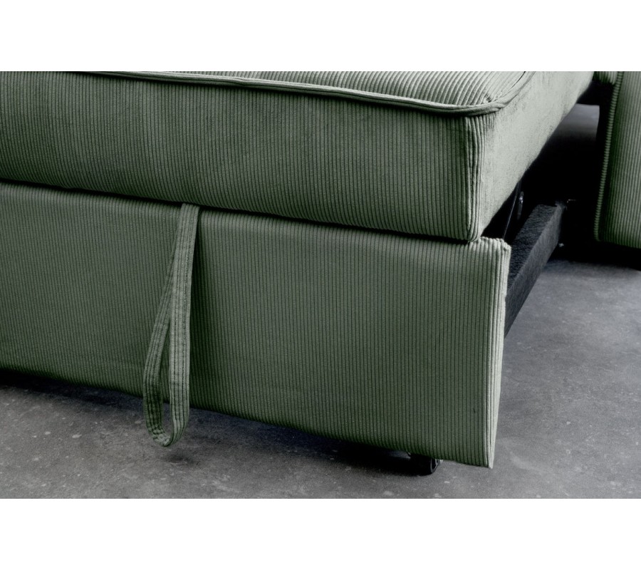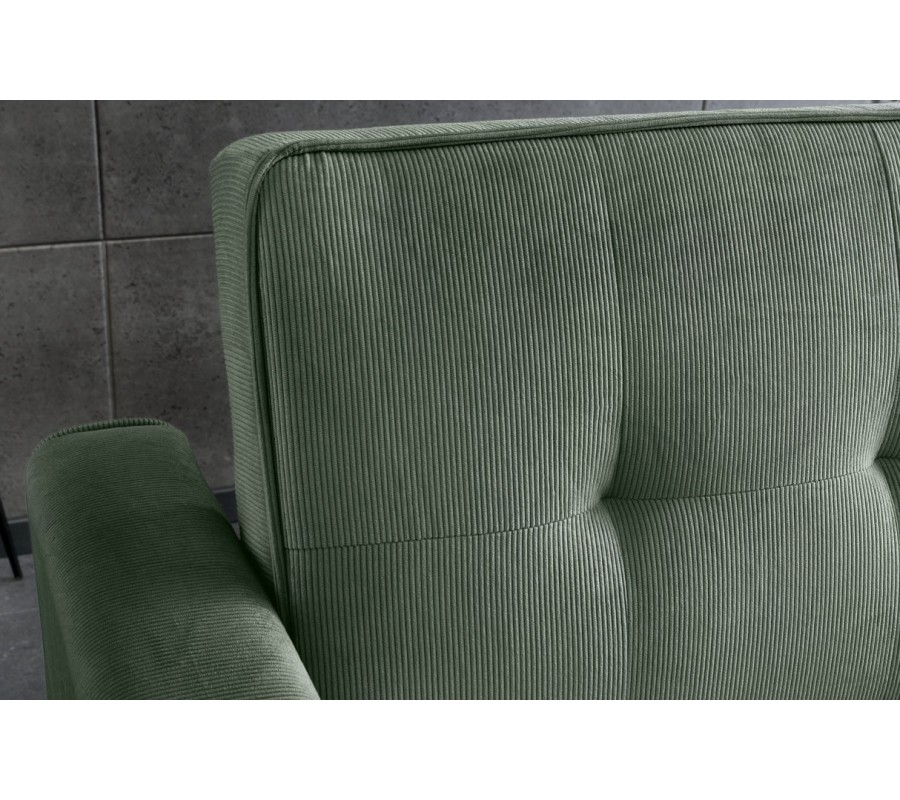 Sedačka je čalouněna manšestrovým potahem v zeleném odstínu, který působí sofistikovaně a zároveň útulně. Sedací část i zádová opěrka jsou prošívané do čtvercového vzoru, který dodává designu strukturu a moderní výraz. Dekorativní prošívání lemu na sedadle, bočních opěrkách i opěradle podtrhuje precizní zpracování a vytváří vizuálně jednotný celek.